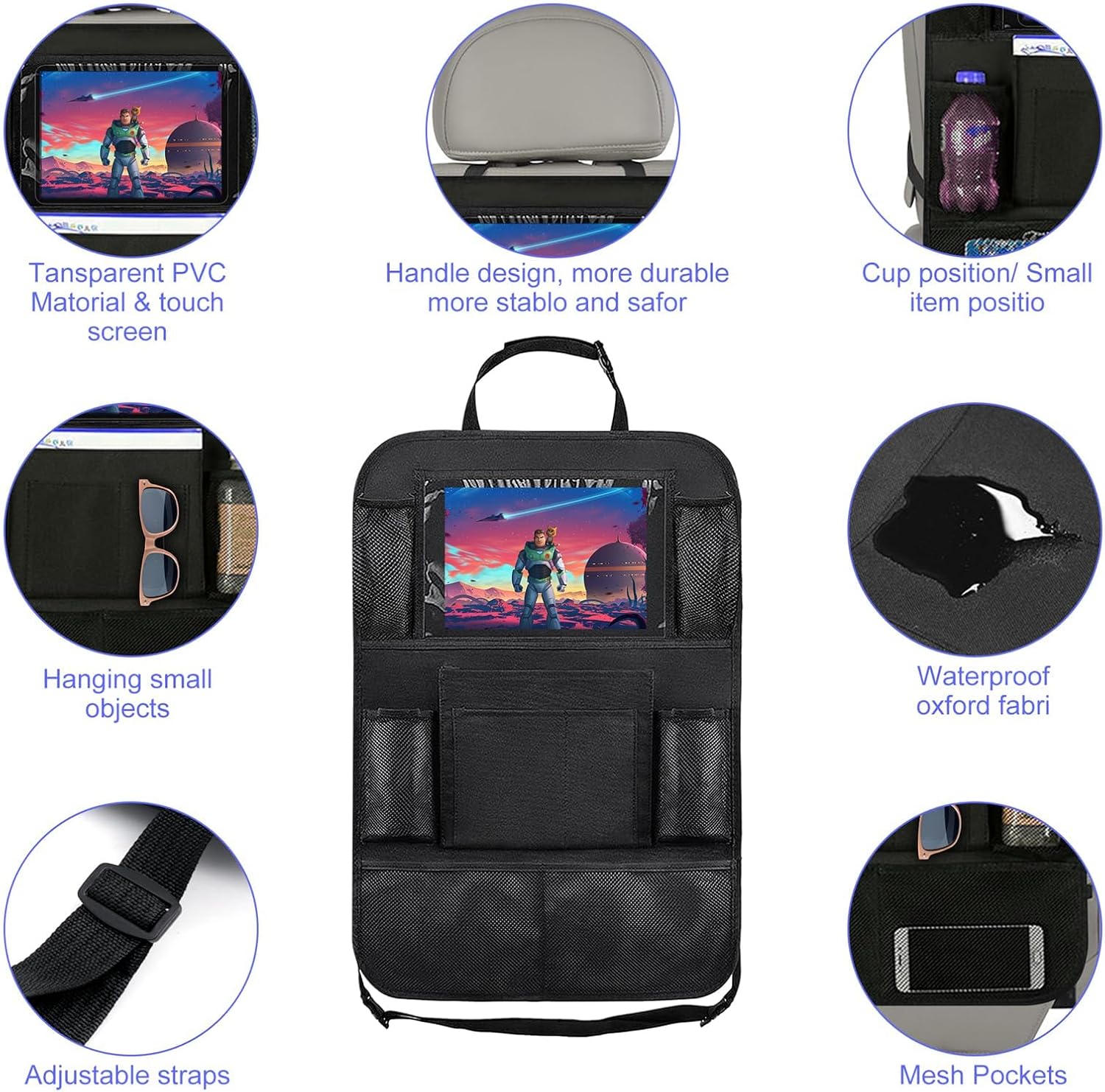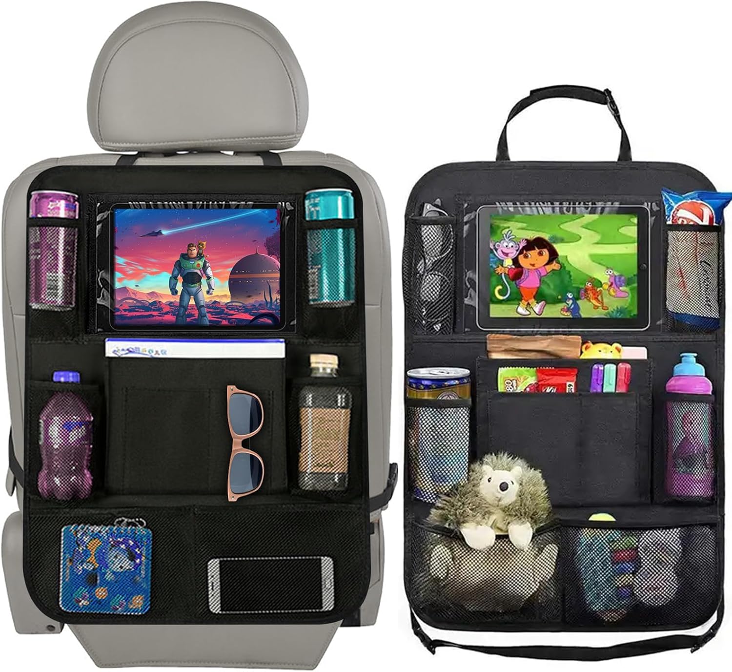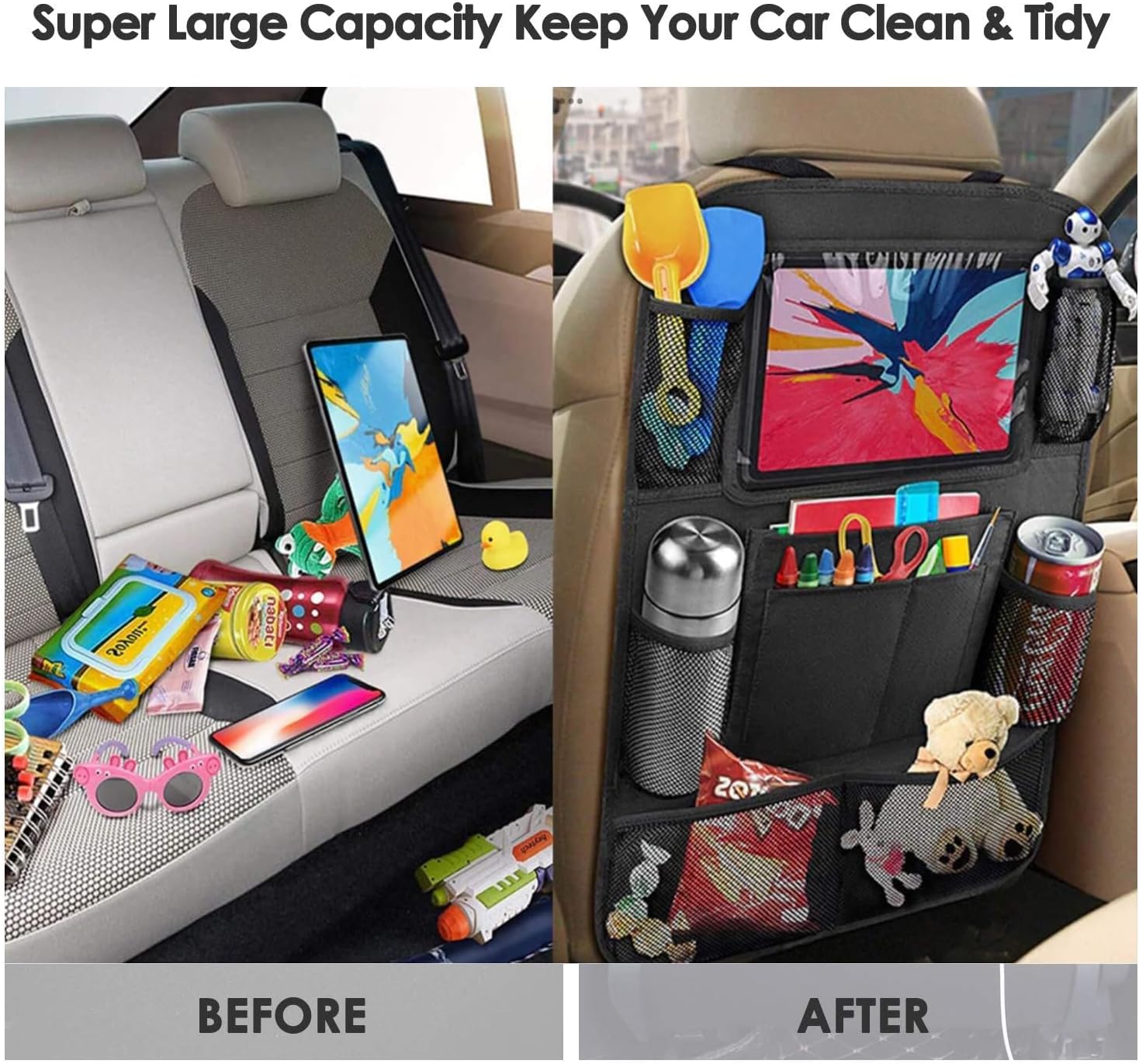 【Easy to install and adjust】 This car organiser back seat for kids, straps and buckles are very easy to adjust and fix, just close the buckle to fix the straps on the top and bottom of the front seats, don’t worry about hanging loose like many other seat pockets