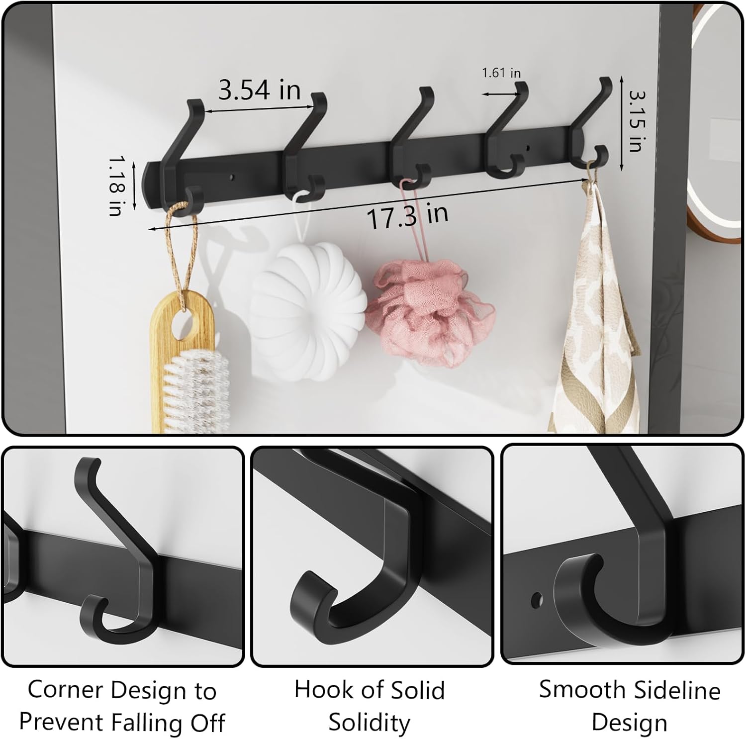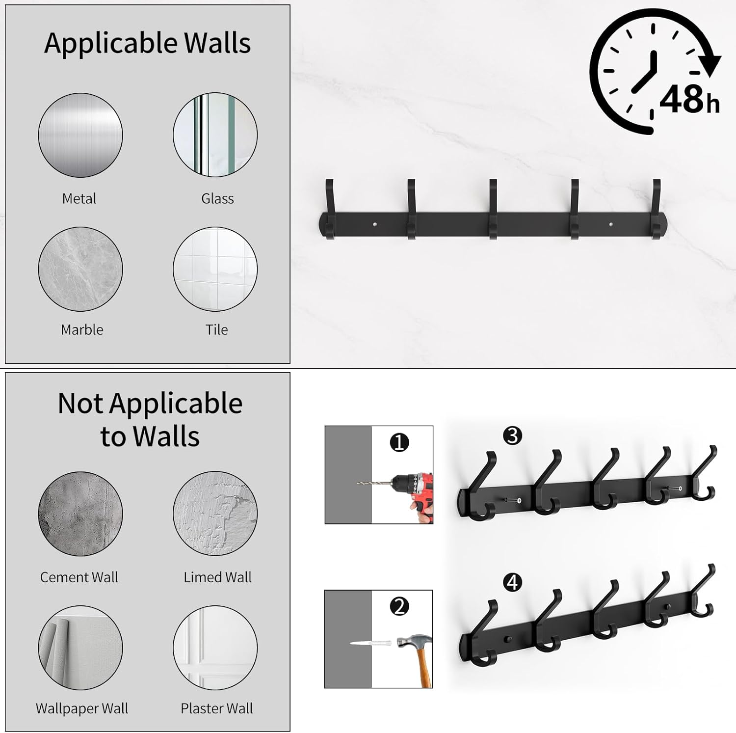 Size:The black coat hook rail measures 44 cm (17.3 inches) long x 8 cm (3.15 inches) high x 3 cm (1.18 inches) wide. The set includes 2 coat hooks wall mount, each with 5 hooks, 2 screws, 2 nuts, 2 expansion screws, 1 nail-free glue, 1 auxiliary sticker, and a 3.54 in gap between each hook.