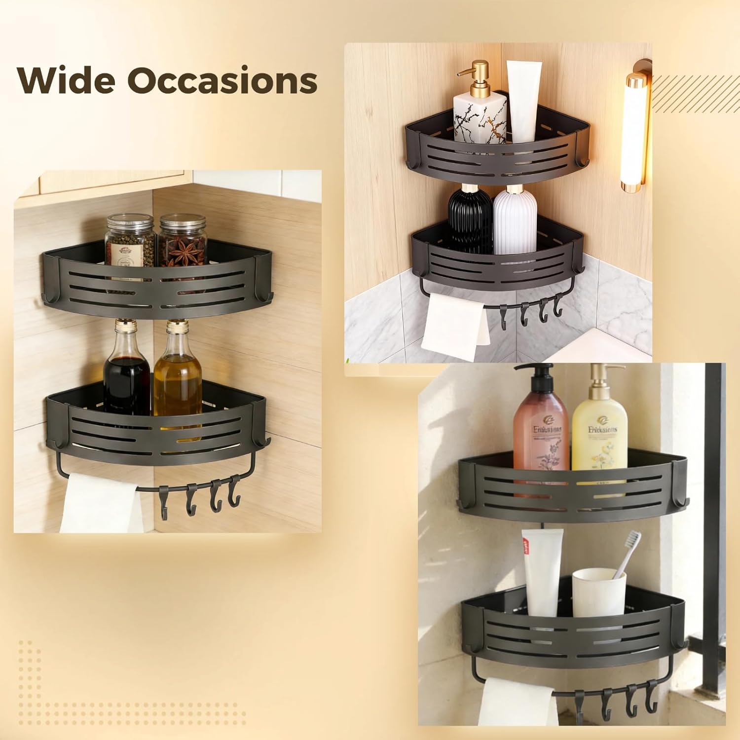 2 Pcs Corner Shower Caddy, No Drilling Aluminum Organizer, Triangular Bathroom Shelves with Towel Bar & Hooks, Rustproof Wall Mount Space-Saving for Shower & Kitchen