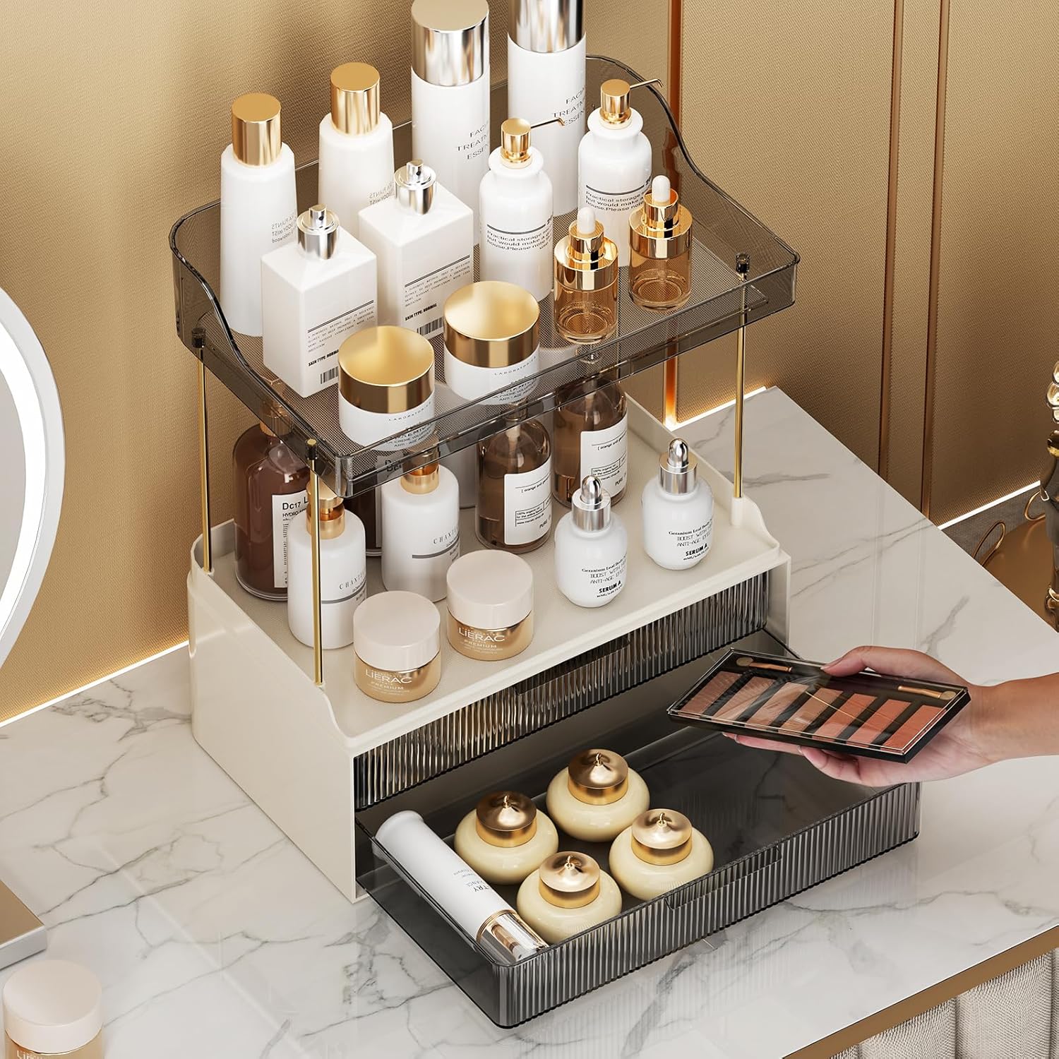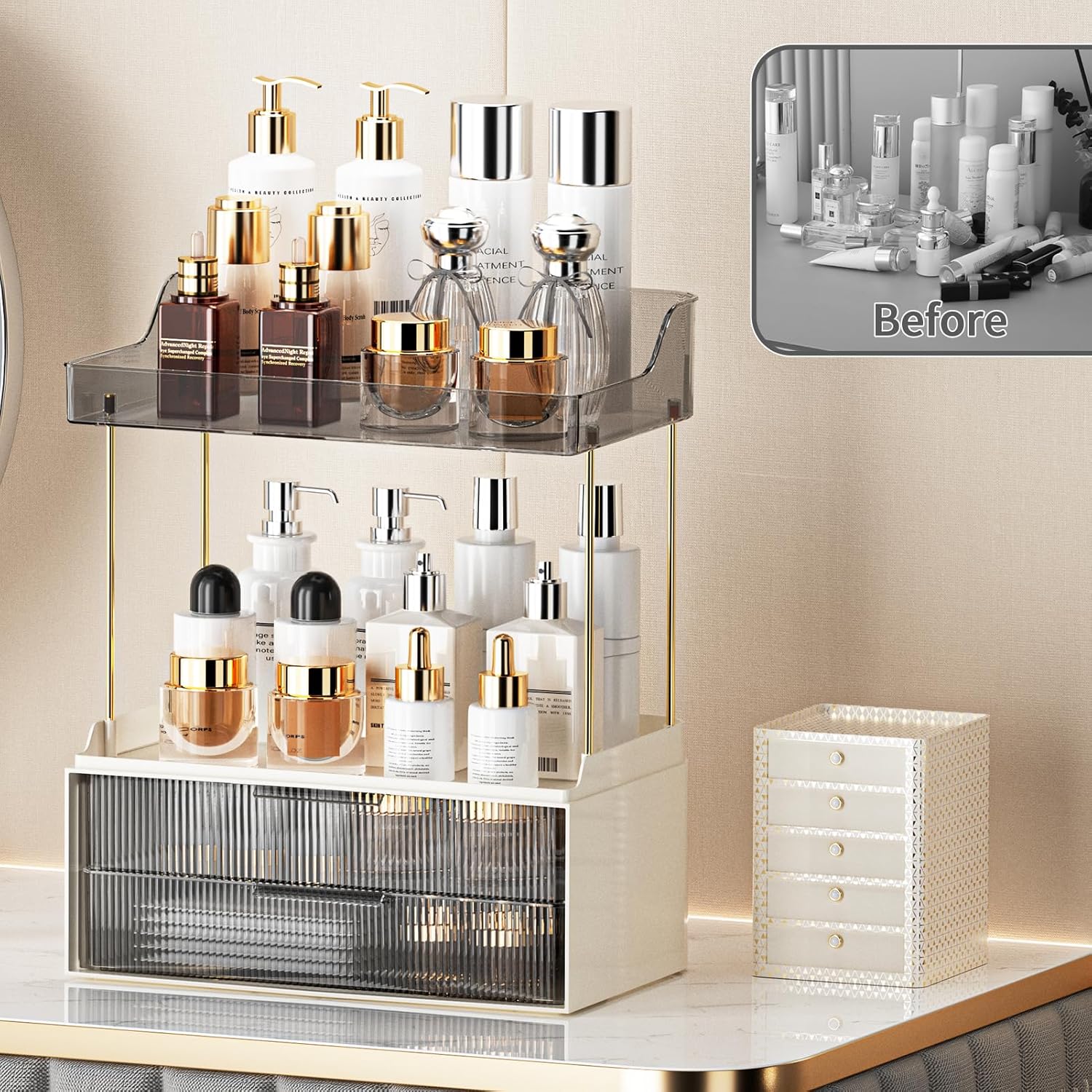 The two drawers provide additional storage space for smaller items, such as cotton swabs, hair ties, and jewelry.The top tier features open tray, perfect for storing bottles, jars, brushes, and other beauty essentials.The space between the skincare organizers accommodates most large bottles of skincare.This bathroom countertop shelf is not only suitable for bathrooms, but can also be used in coffee bars, kitchens, living rooms, offices, or any other room where extra storage space is needed.