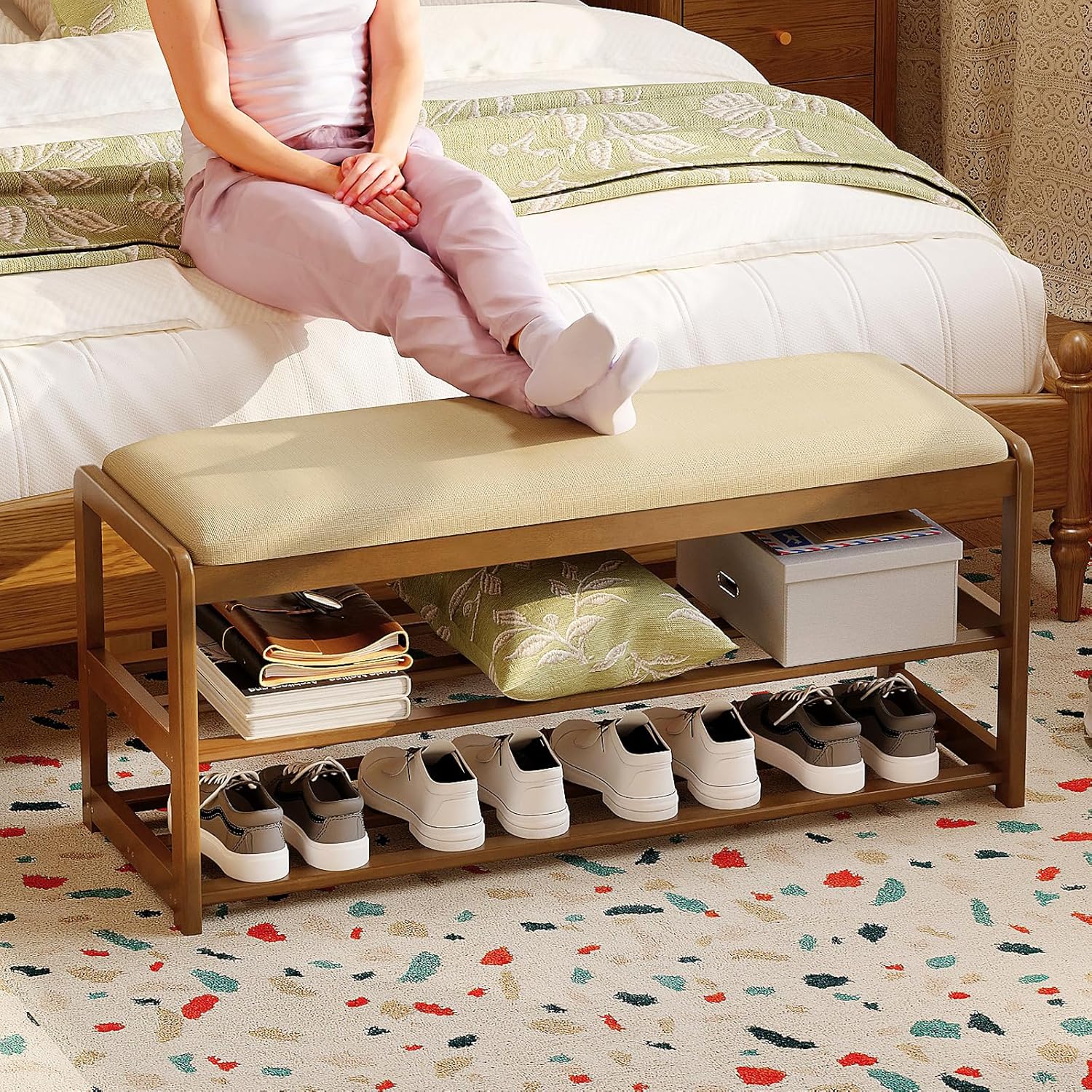 【All-in-One Entryway Bench with Storage】Combine comfort and function with this bamboo shoe bench featuring 2 tiers of open shelving, a soft cushion for seating, and a hidden drawer to store keys, wallets, and more—ideal for any entryway or hallway