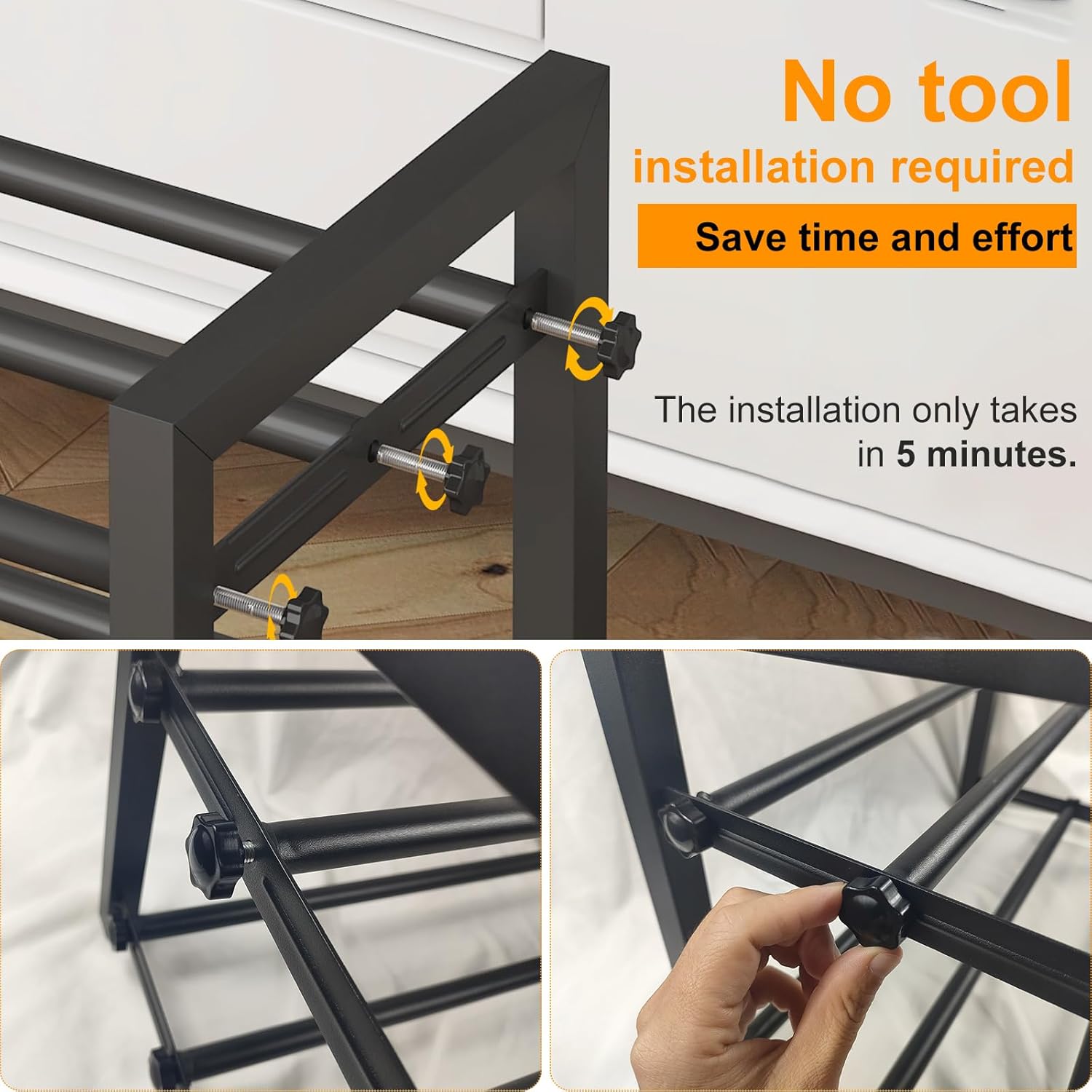 【Heavy-Duty Stability】 Constructed with 13mm thick steel tubes and reinforced connectors, each layer can bear a weight of 50 pounds, this small shoe rack holds 6–9 pairs of shoes without wobbling or bending. Rust-resistant finish ensures long-lasting use indoors or outdoors.
