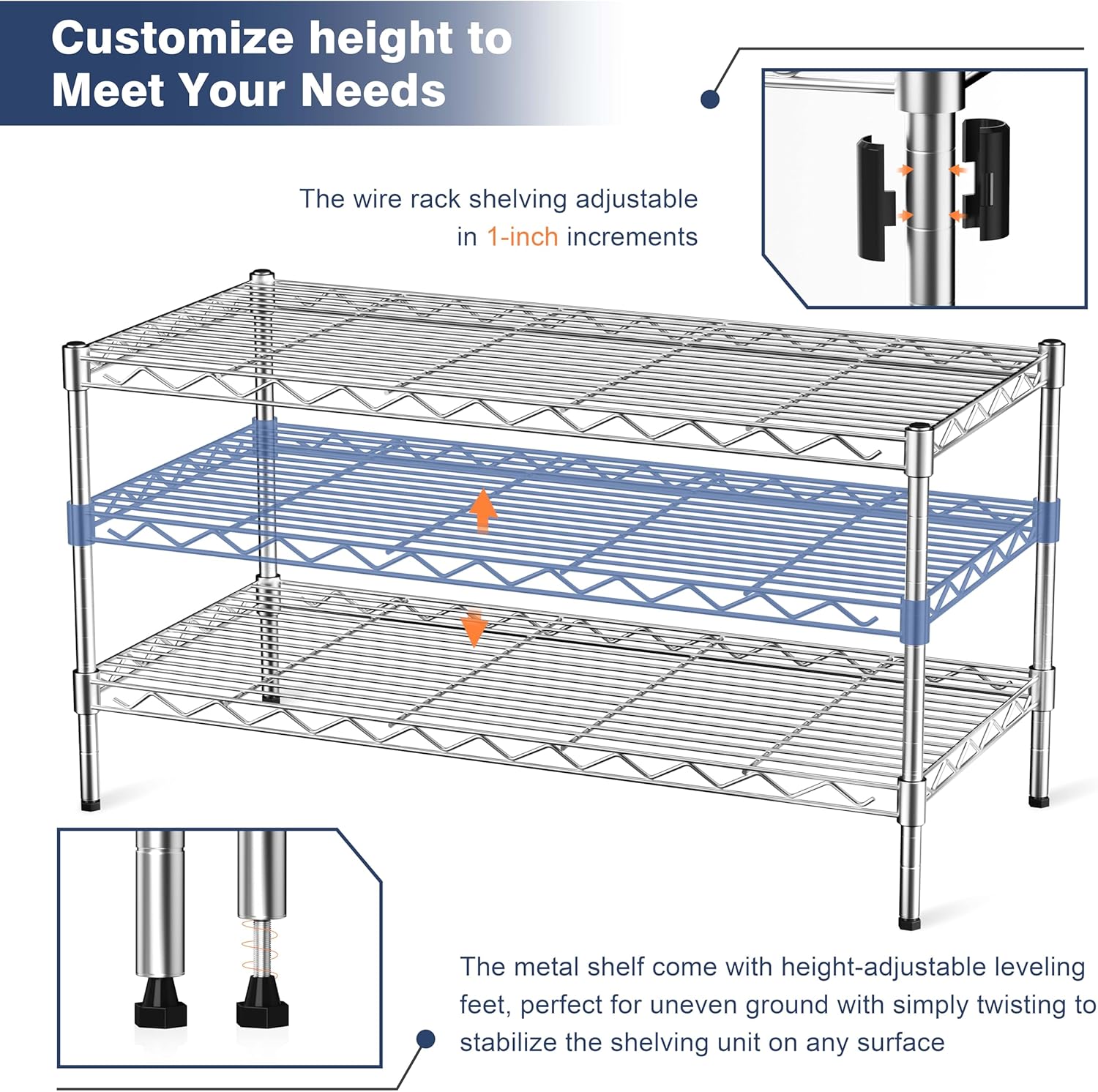 【Flexible & Adjustable Height】Customize your metal shelving unit to fit your needs. The design allows for easy height adjustments, making it perfect for organizing items of different sizes and optimizing your space.This wire shelves adjustable in 1-inch increments.