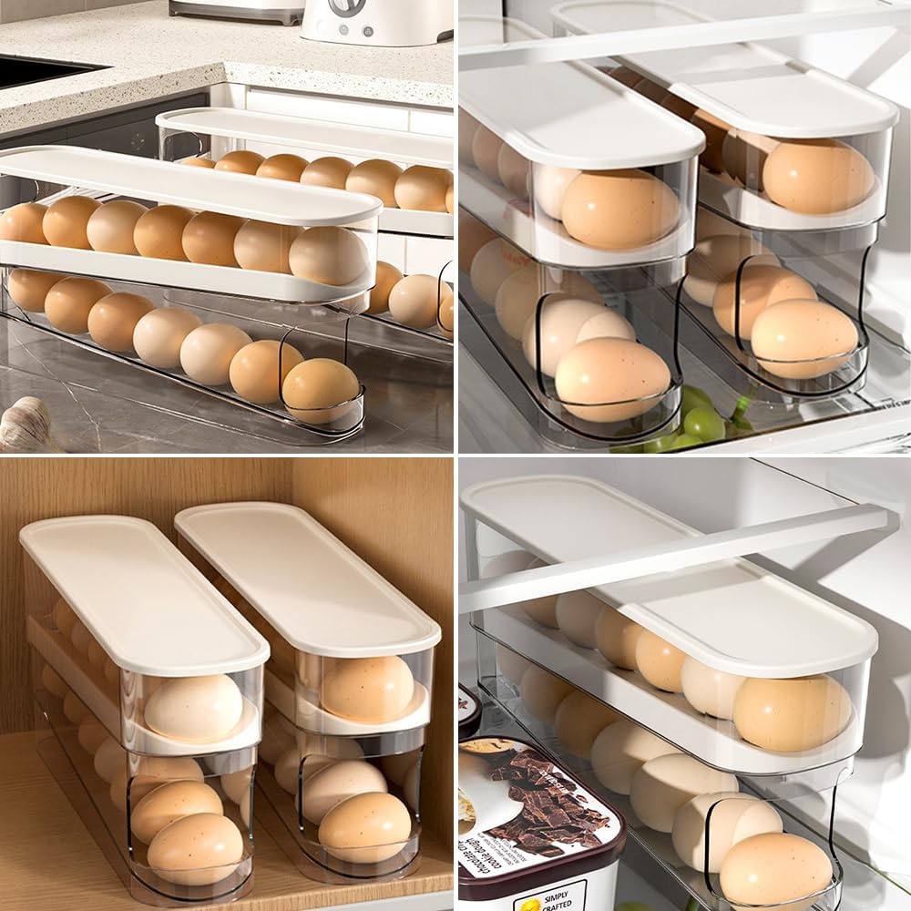 🥚【Automatic Scrolling Egg Rack Holder】The egg holder for fridge adopts a gentle slope design. The eggs will automatically rolling forward slowly to fill and you will take out eggs easily without lifting the lid. TIP:Don’t worry about the eggs rolling too fast and cracking.