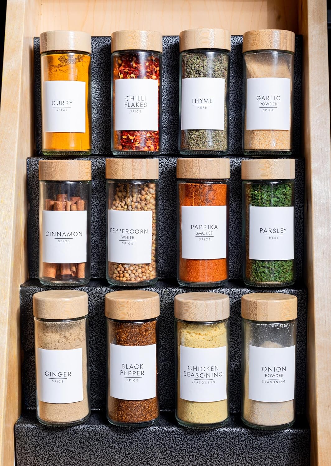 NOW WITH LABELS: All-in-One Spice Organization System: Everything you need to organize beautifully in one box. Includes 24 crystal-clear 120ml glass jars, 24 eco-friendly bamboo lids with airtight seals, 24 flip-top shaker lids for easy dispensing, and a precision funnel for mess-free filling. Plus 360 waterproof labels featuring 231 pre-printed spice labels spanning global cuisines, 9 blank labels for your custom blends and 120 best-by labels.