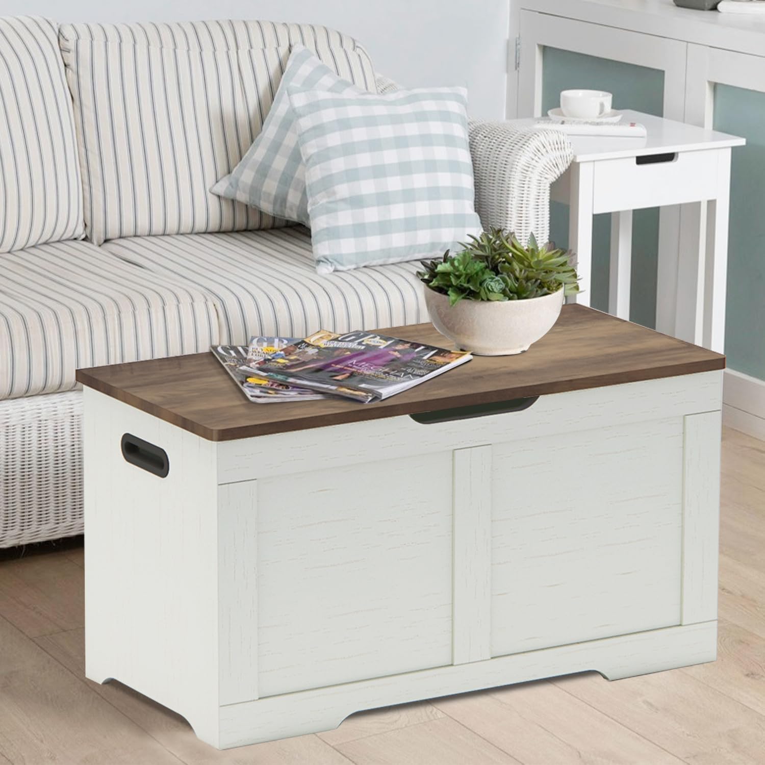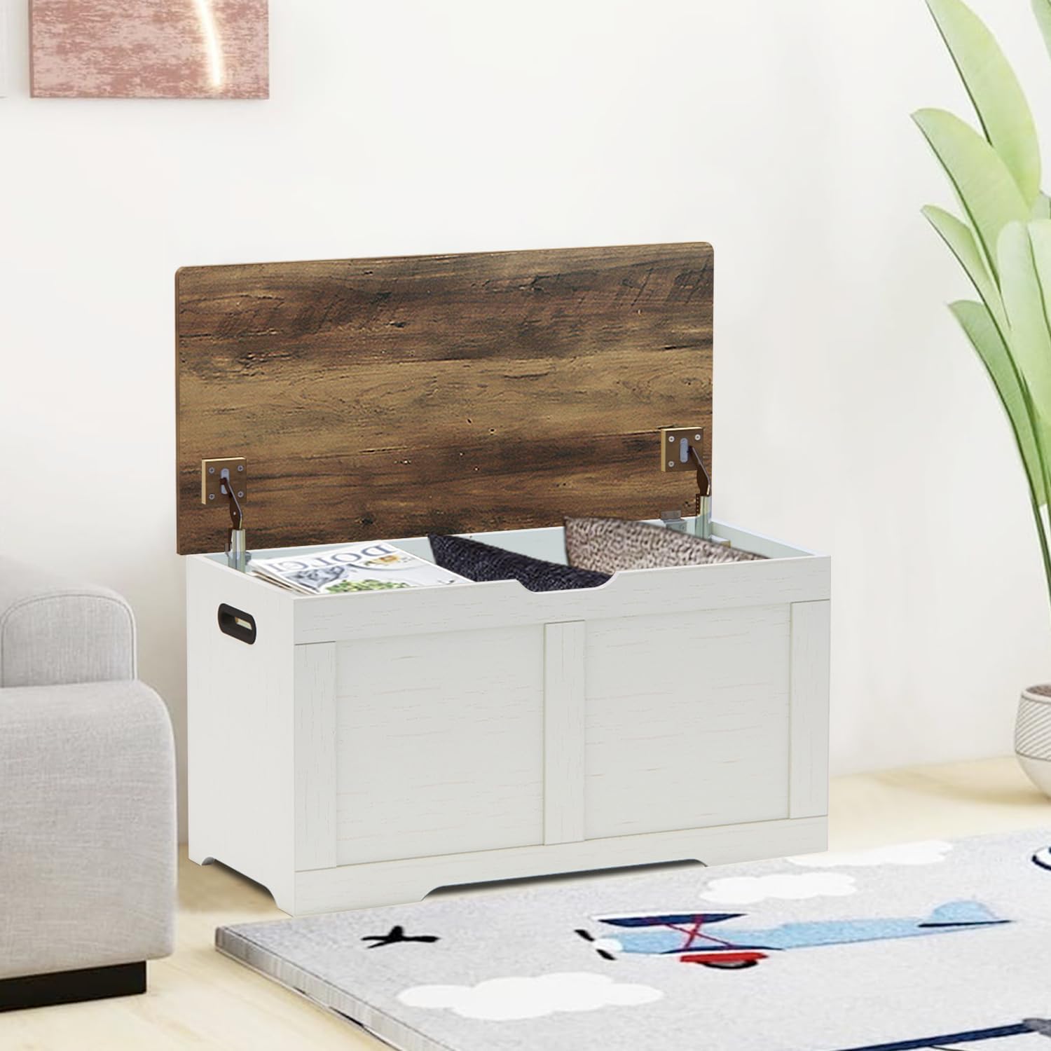 31.5″ Storage Chest, Wooden Storage Bench, Lift Top Toy Chest with 2 Safety Hinges, Large Toy Box, Entryway Shoes Bench for Living Room, Bedroom, Brown and Rustic White