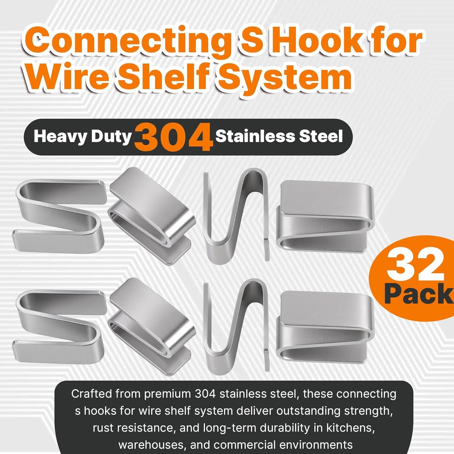 32 Pack Connecting S Hook for Wire Shelf System,Wire Shelf S Hooks – Heavy Duty 304 Stainless Steel – for Warehouses Shopping Malls Garden Places