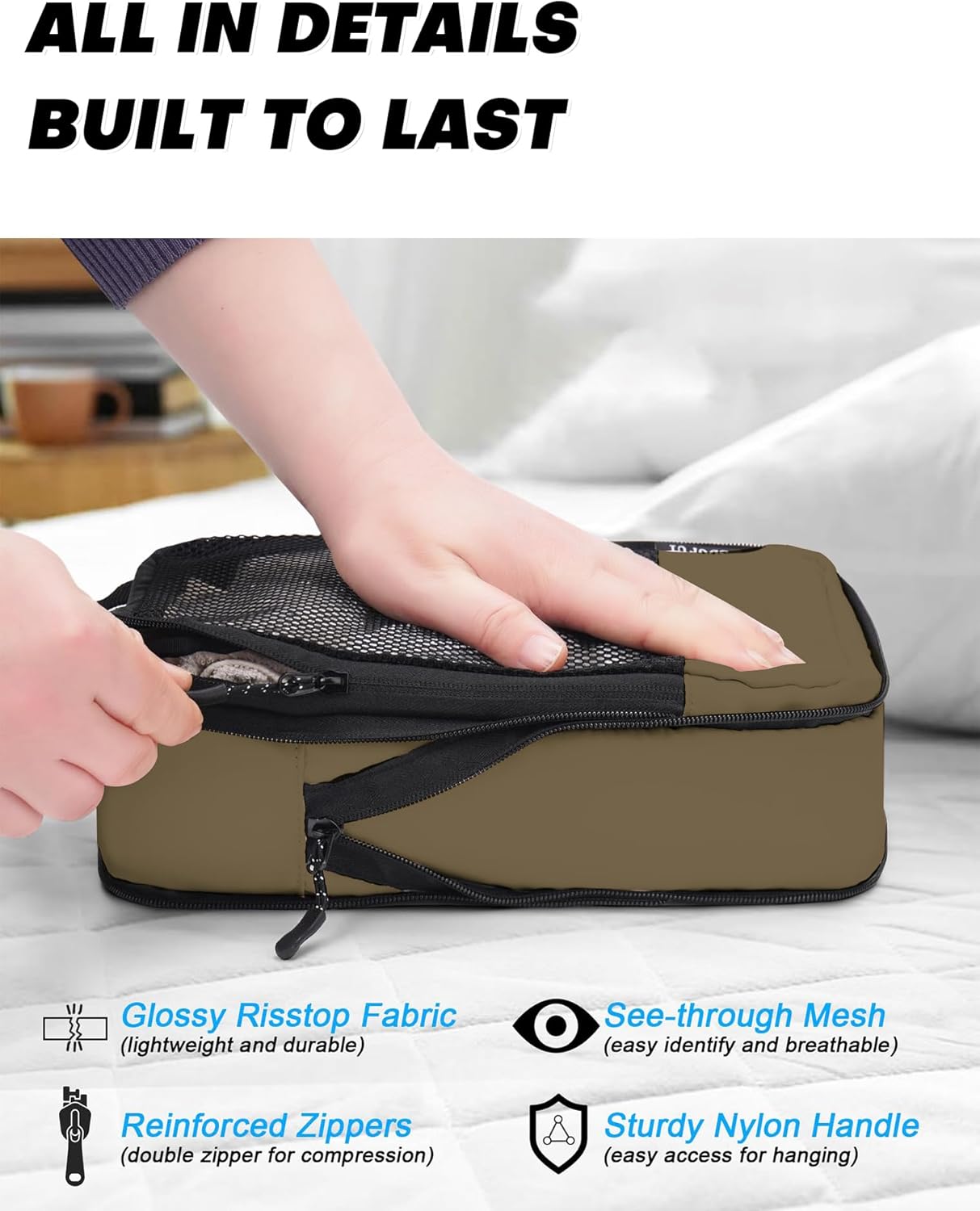 Compressible & Space-Saving: With compression packing cubes, you can pack smarter and fit more into your luggage. Our two-zipper system packing cube could compress clothes and saves up to 40% space, so you can bring everything you need without the extra bulk