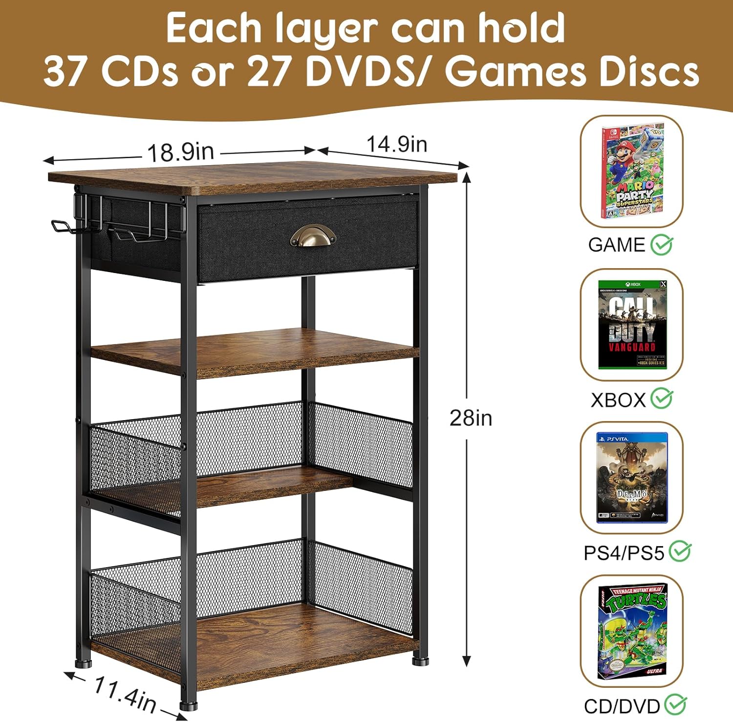 The dimensions of our gaming stand are 16.5(L) x 11.4(W) x 27.5(H) inches,Our game console shelf can hold various types of discs. Including Switch/PS4/PS5/CD/DVD and so on, each tier can hold roughly 37 CDs or hold 27 DVDs or game discs, large capacity storage space to meet your storage needs.