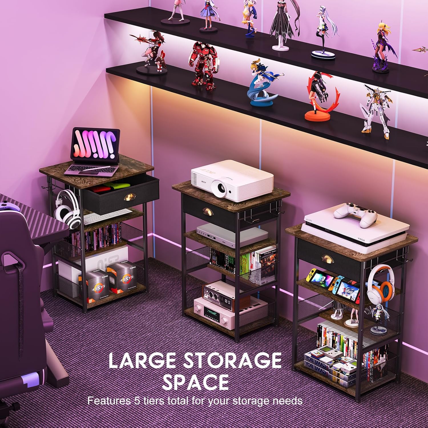 [With Drawer] The media shelf contain a drawer made up of non-woven fabric, the drawer is supported by a hardboard, can put some small devices, such as grips, data cables, headphones. Brass handles for easy pull-out of video game shelf drawer perfect for store devices