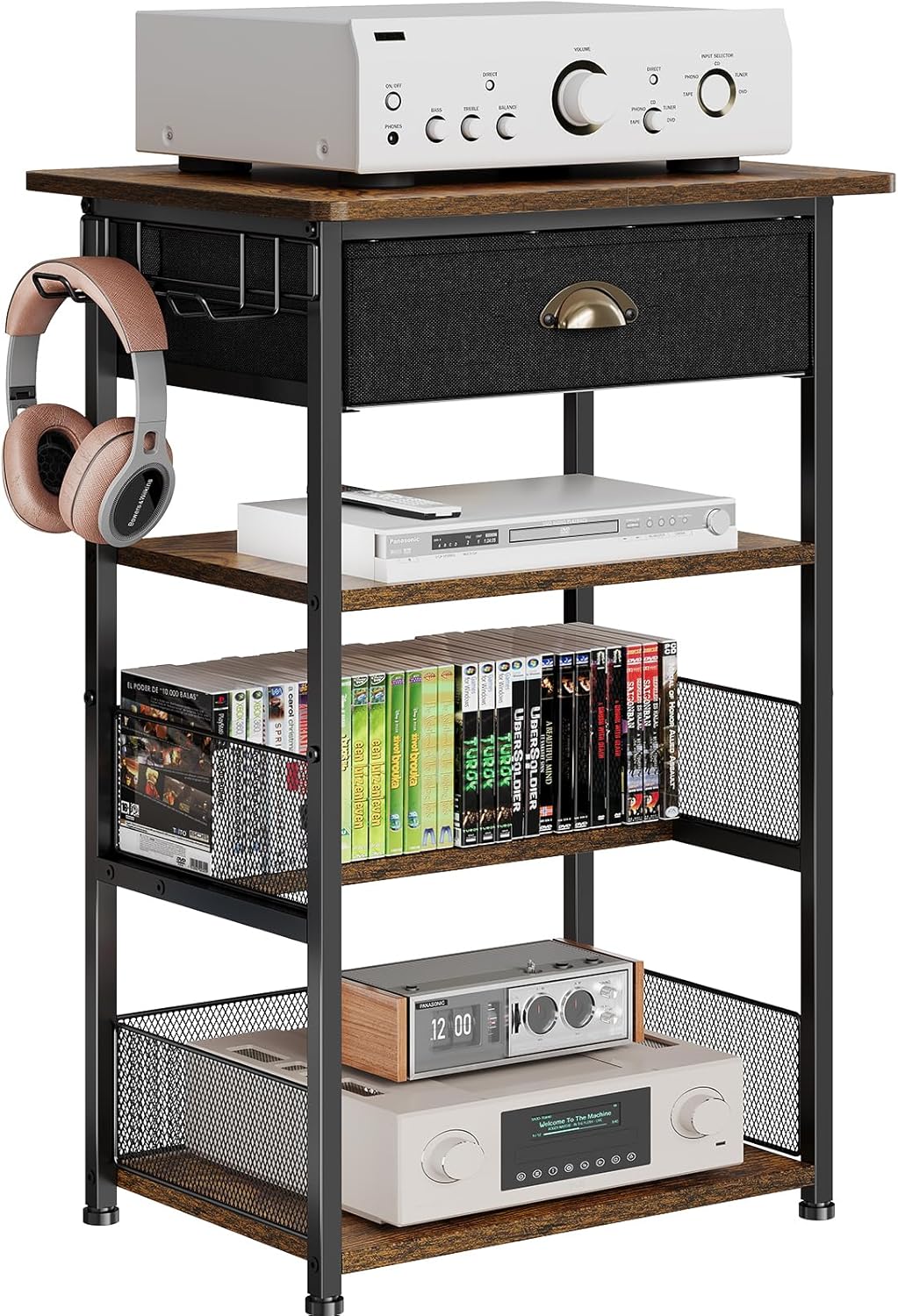 4-Tier AV Media Stand with Drawer, Video Game Console Shelf with 2 Hooks, Audio Rack Tower Perfect for/Xbox/ PS5/Switch/Game Consoles/DVD/Record Player/Projector/Sky Box/TV Accessories