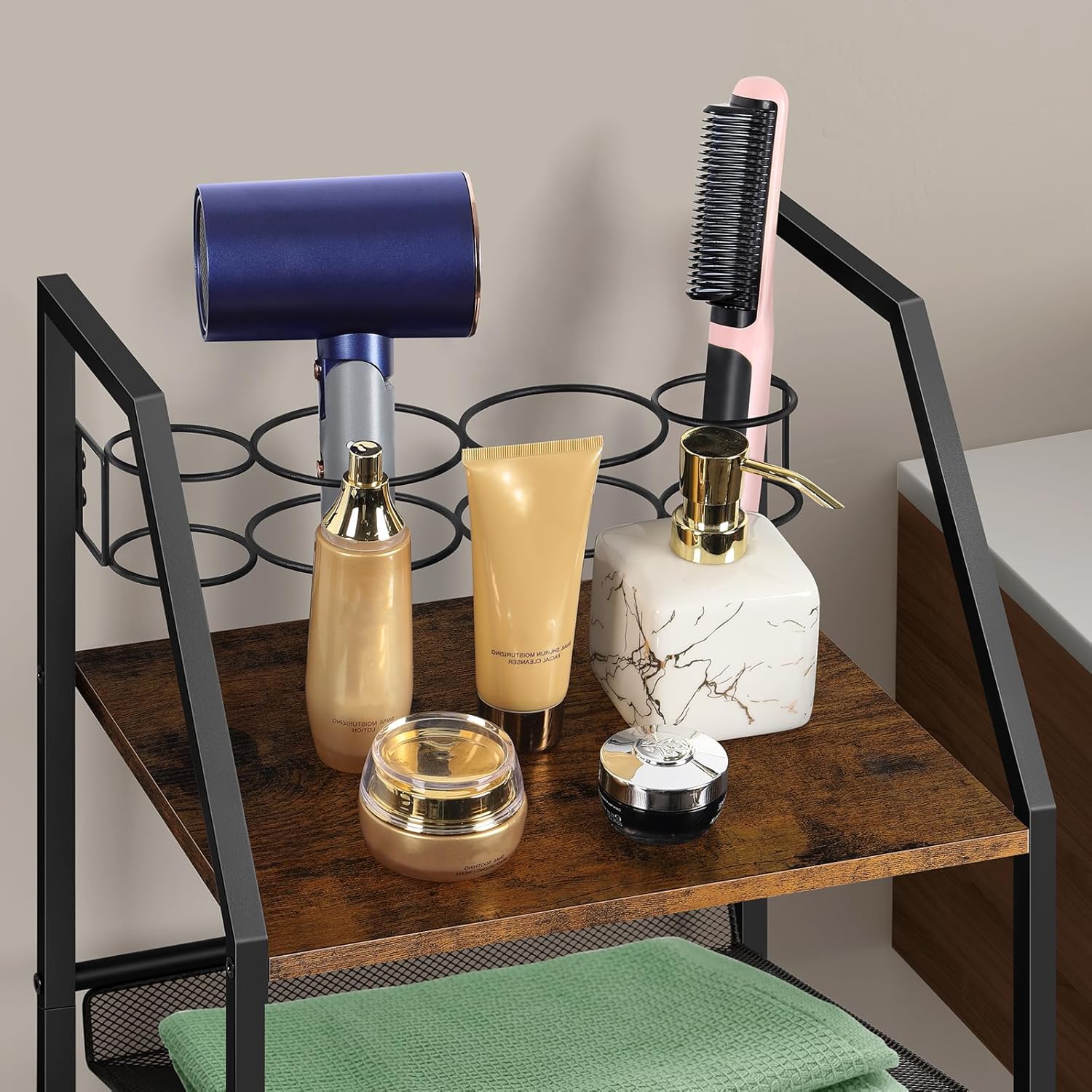The hair tool organizer cart designed with a wooden top, makes your cart stand out from other ordinary carts.
