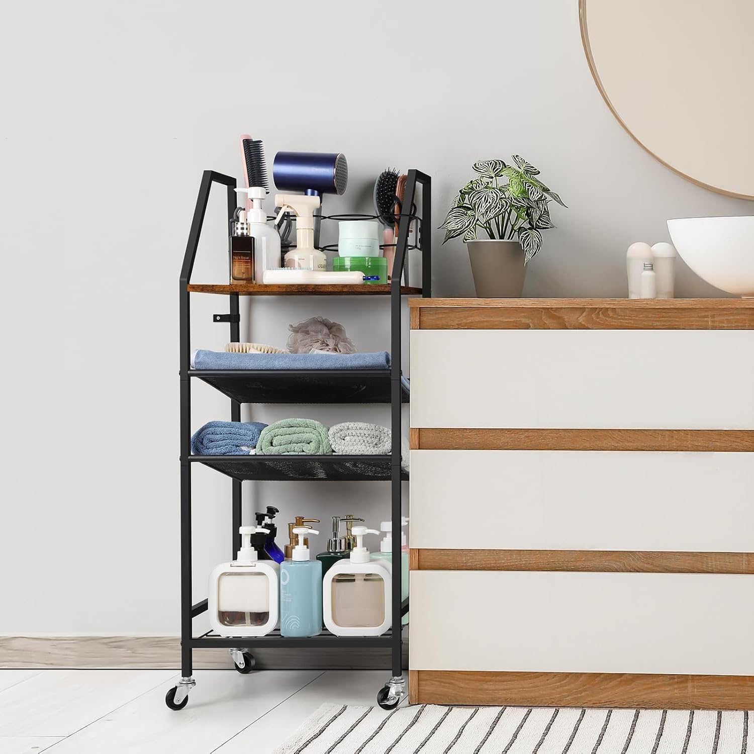 4 Universal Wheels: Thetowel holder for bathroom comes with 4 swivel casters,2 lockable,it can easily move to any places even when fully loaded, It can organize your bathroom,living room, and any place you want, making your life easier