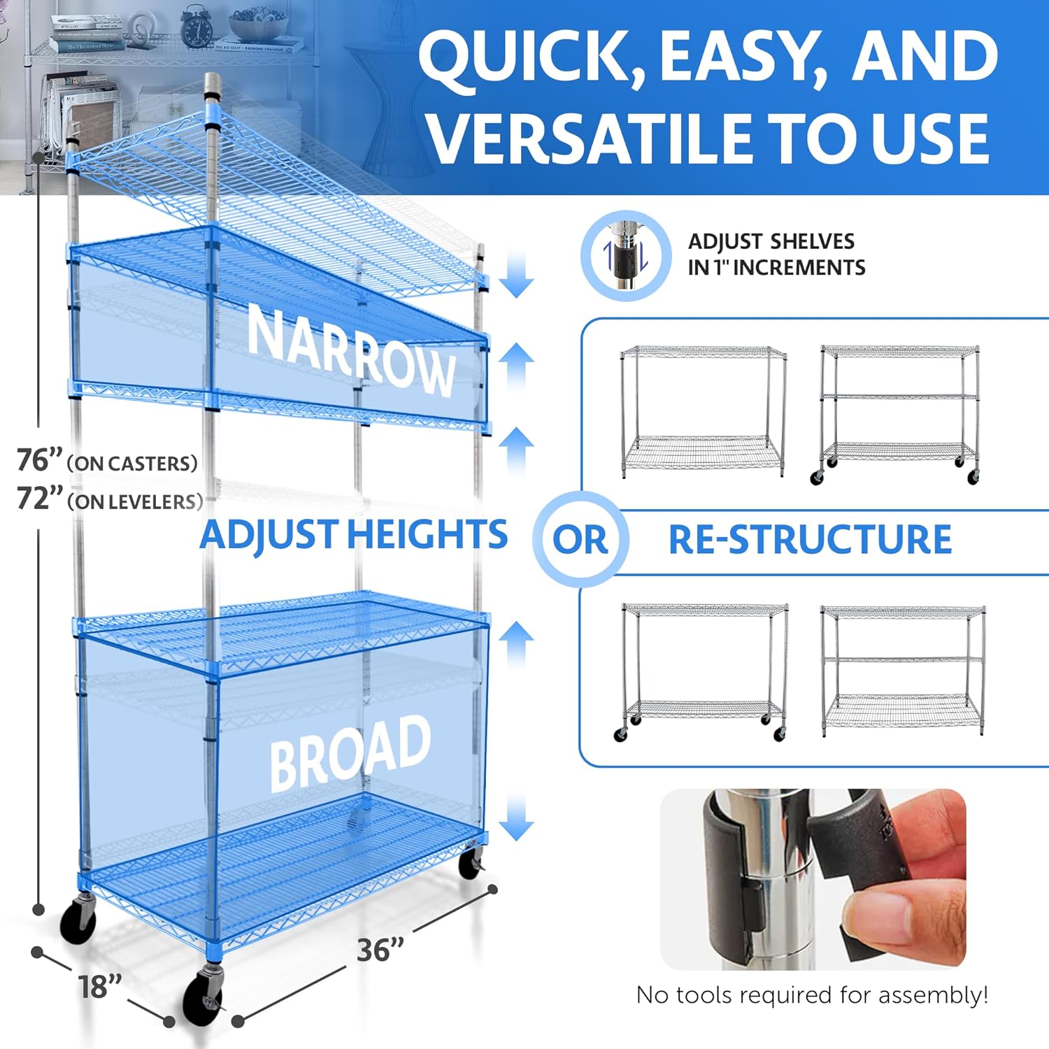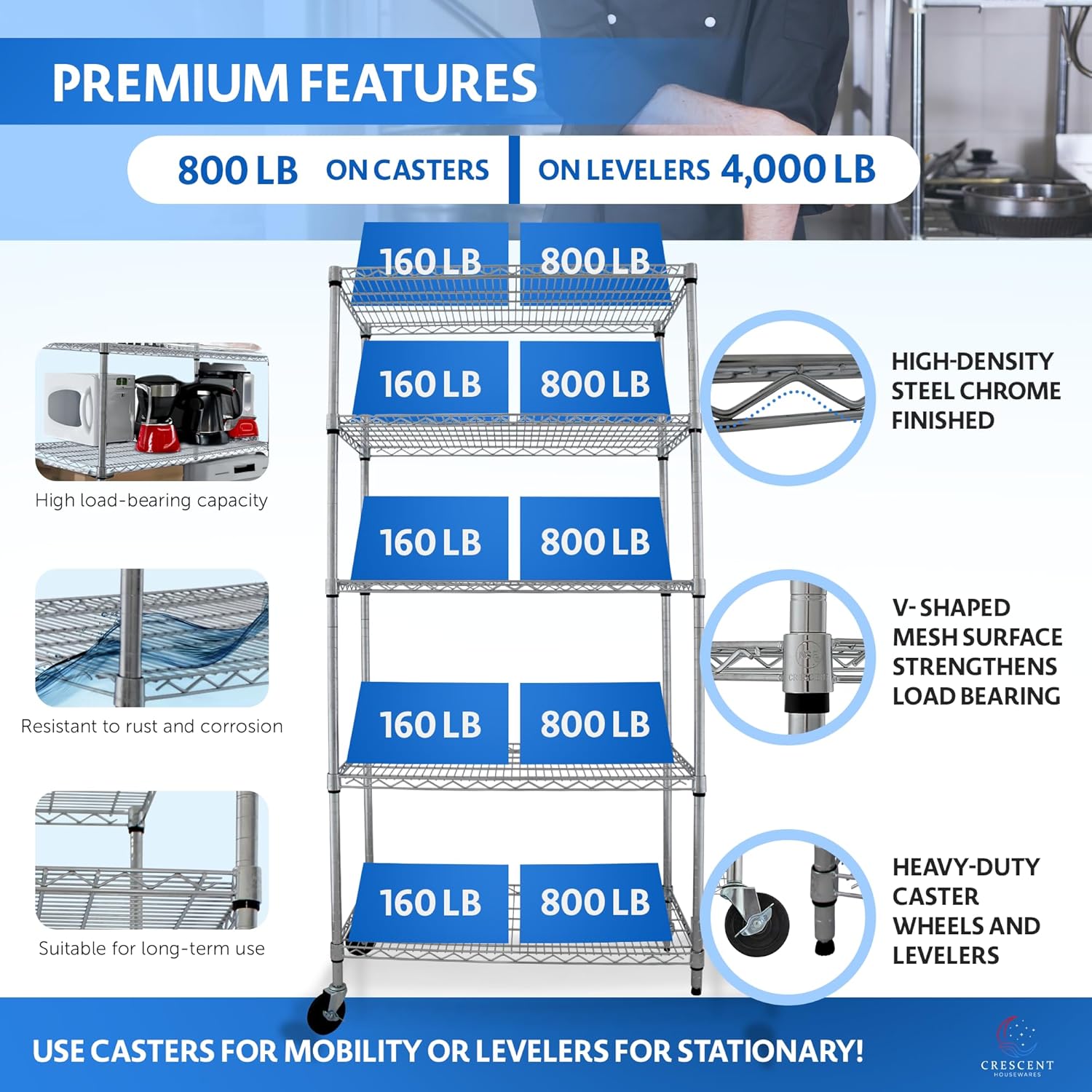 4000 LBS Heavy Duty Metal Shelving Unit – 36x18x76 NSF 5-Tier Wire Rack with Wheels, Adjustable Garage Storage Shelves, Chrome Wire Shelving for Kitchen, Warehouse, Bakers Rack – Crescent