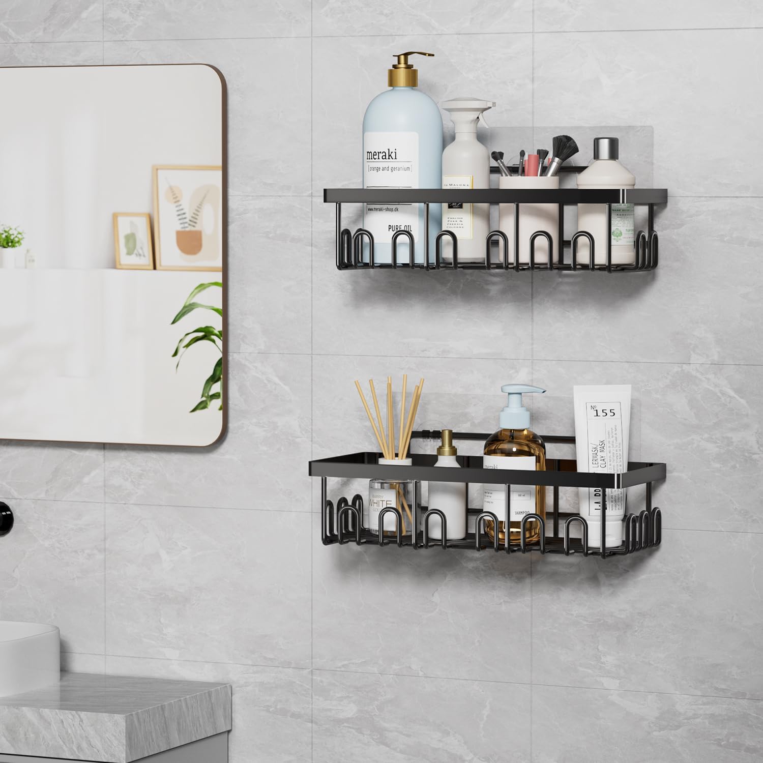 5 PCS Large storage shower caddy: The black bathroom organizer comes with 5 pieces for different uses, including 2 shower caddies, 2 soap holders, 1 toothbrush holde and 5 adhesives. It is suitable for bathrooms, kitchens, Rv, living rooms and bedrooms, the space can be fully utilized