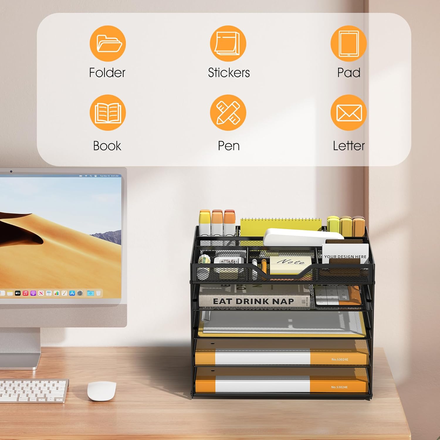 5 Tier Paper Letter Tray with 3 Drop-in Pen Holders, Mesh Desk File Organizer with Handle, Desk Organizers and Accessories for School,Home, Office Supplies Storage-Black