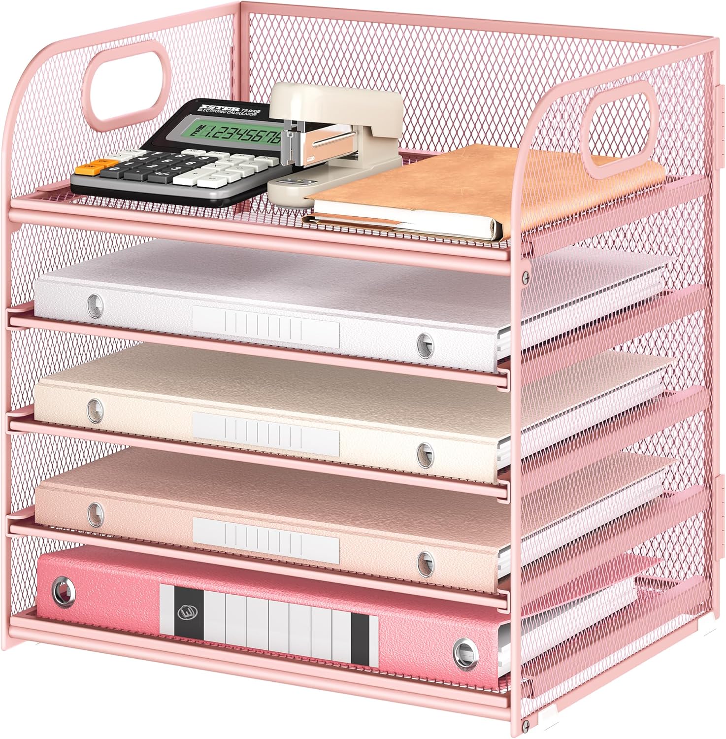 5 Tray Paper Organizer Letter Tray with Handle – Mesh Desk File Organizer, Paper Sorter Organizer for Office, Home or School File Folder Holder – Pink
