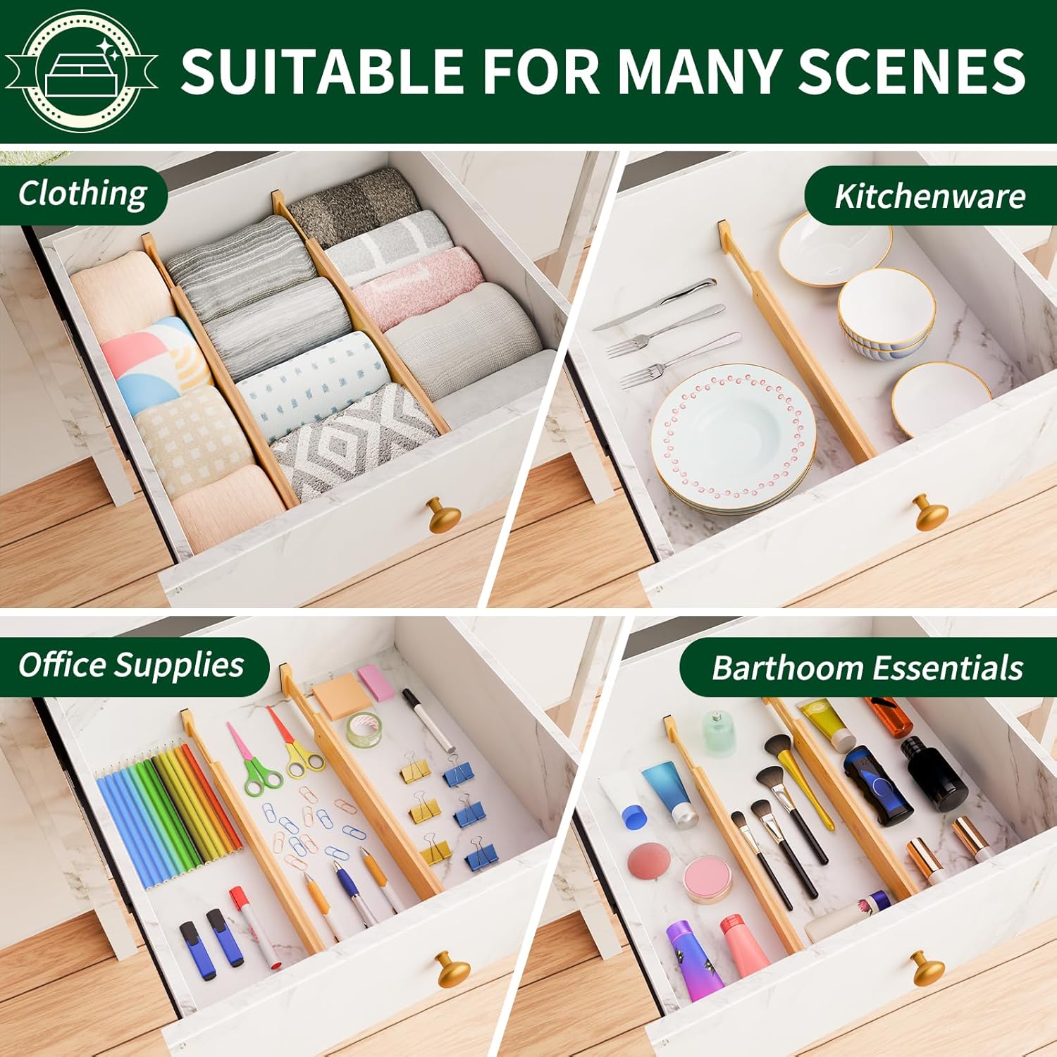 Stylish & Eco-Friendly Design:Made from sustainable moso bamboo, our drawer dividers are not only durable but also aesthetically pleasing. Non-slip pads on both ends prevent damage to your drawers while ensuring stability