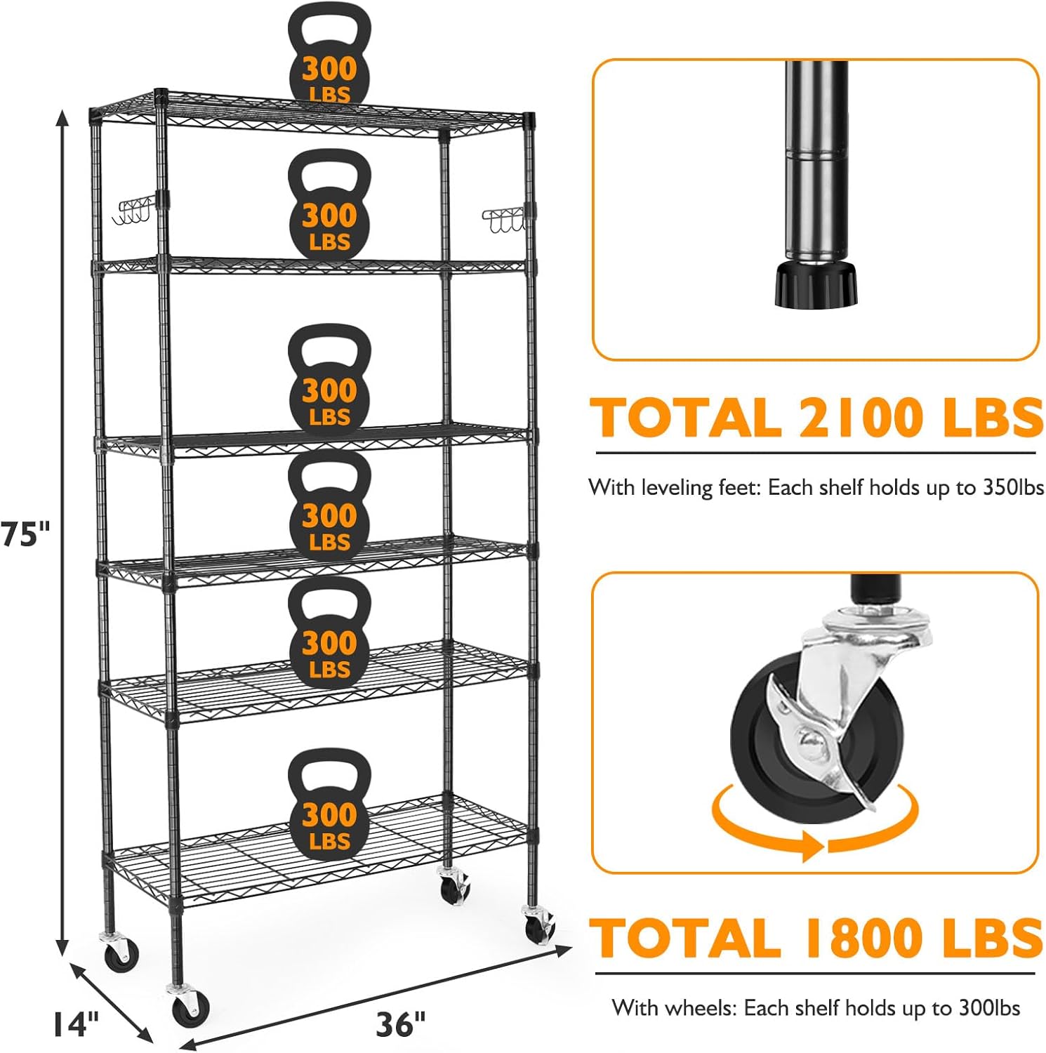 6 Tier Storage Shelves with Wheels, 2100lbs Capacity Heavy Duty Shelving Units, 14x36x75inch Adjustable Metal Shelf Wire Shelving Rack for Garage, Kitchen, Office, Black