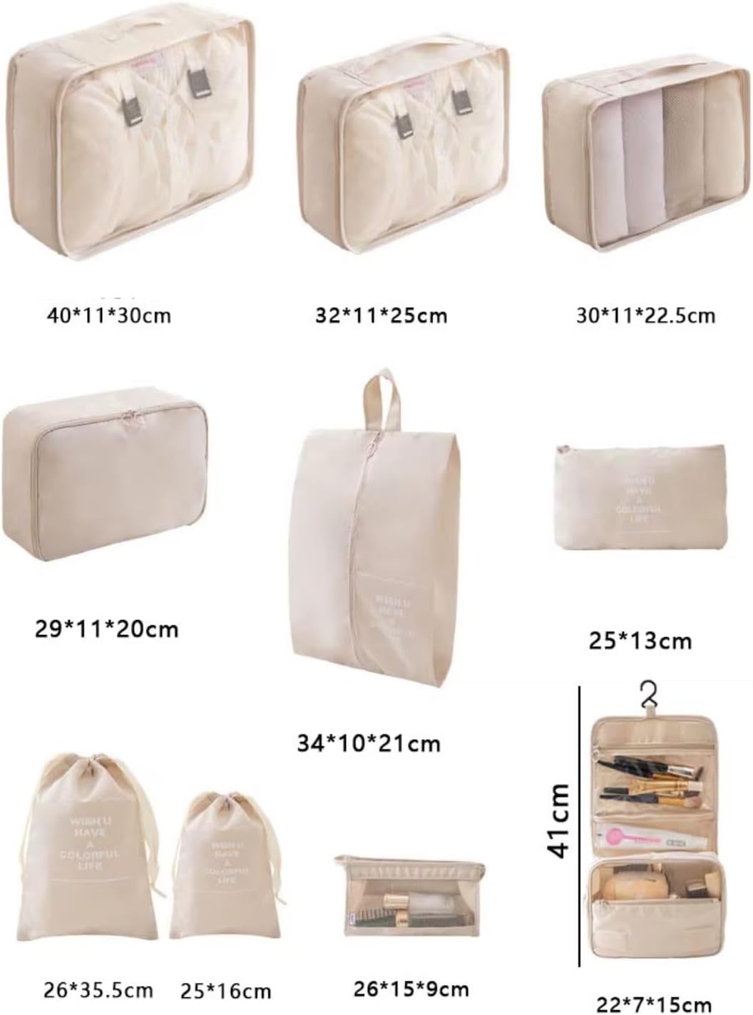 Transform your packing experience with this comprehensive 8-piece travel organizer set. The collection includes various sized packing cubes, a dedicated toiletry bag, shoe storage, and a cosmetics organizer – everything you need for a well-organized suitcase. Each piece is crafted from durable gray material with mesh panels for visibility and ventilation. The set features smooth-running zippers and convenient carrying handles, making it easy to transfer between luggage pieces. The packing cubes help maximize space in your suitcase while keeping clothes neat and wrinkle-free. The toiletry bag comes with multiple compartments to store all your personal care items securely. Featuring a charming ‘Wish U Have A Colorful Life’ message, these organizers add both style and functionality to your travel routine. Perfect for both short getaways and extended trips, this set helps maintain order in your luggage while making packing and unpacking a breeze.