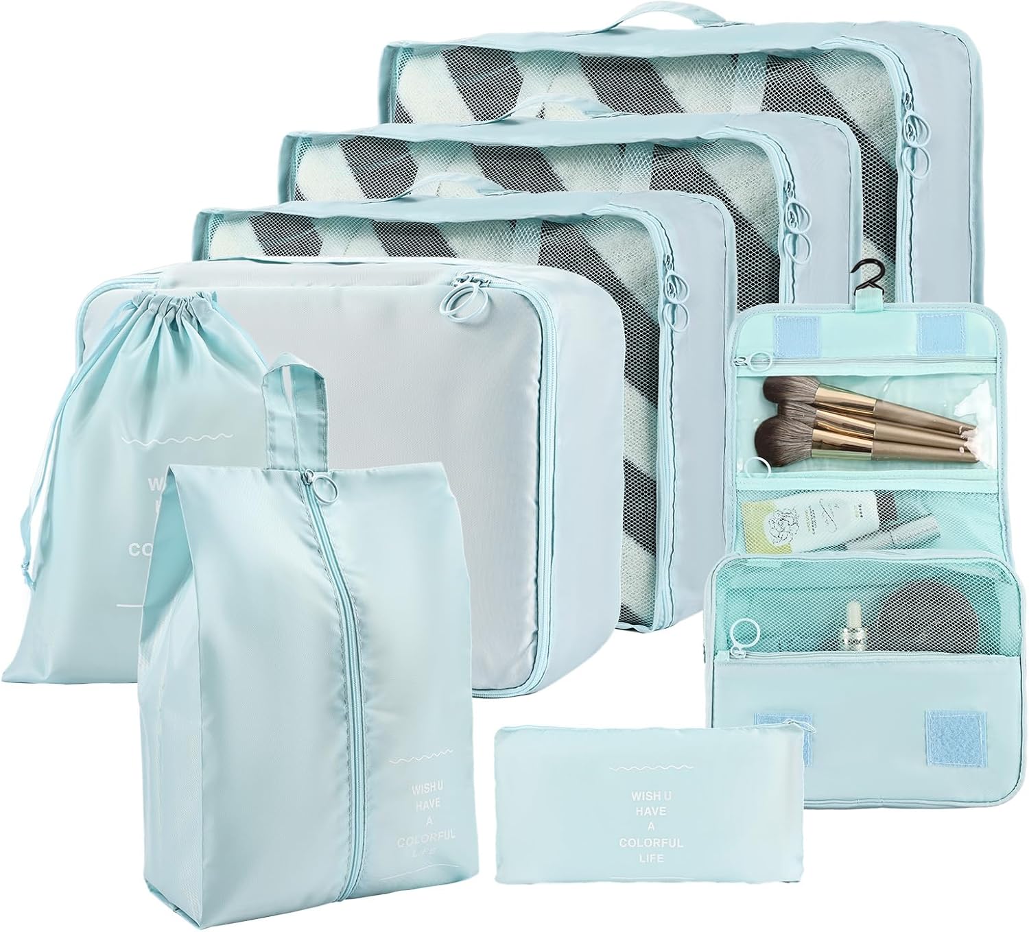 Organized Packing and Space Saving:This 8 set packing cubes set offers multiple sizes to separate your clothing and accessories, maximizing luggage space. Available in vibrant colors like navy, blue, pink, and beige, these cubes help keep your items organized, making packing and unpacking faster and more efficient, while also preventing misplaced items.
