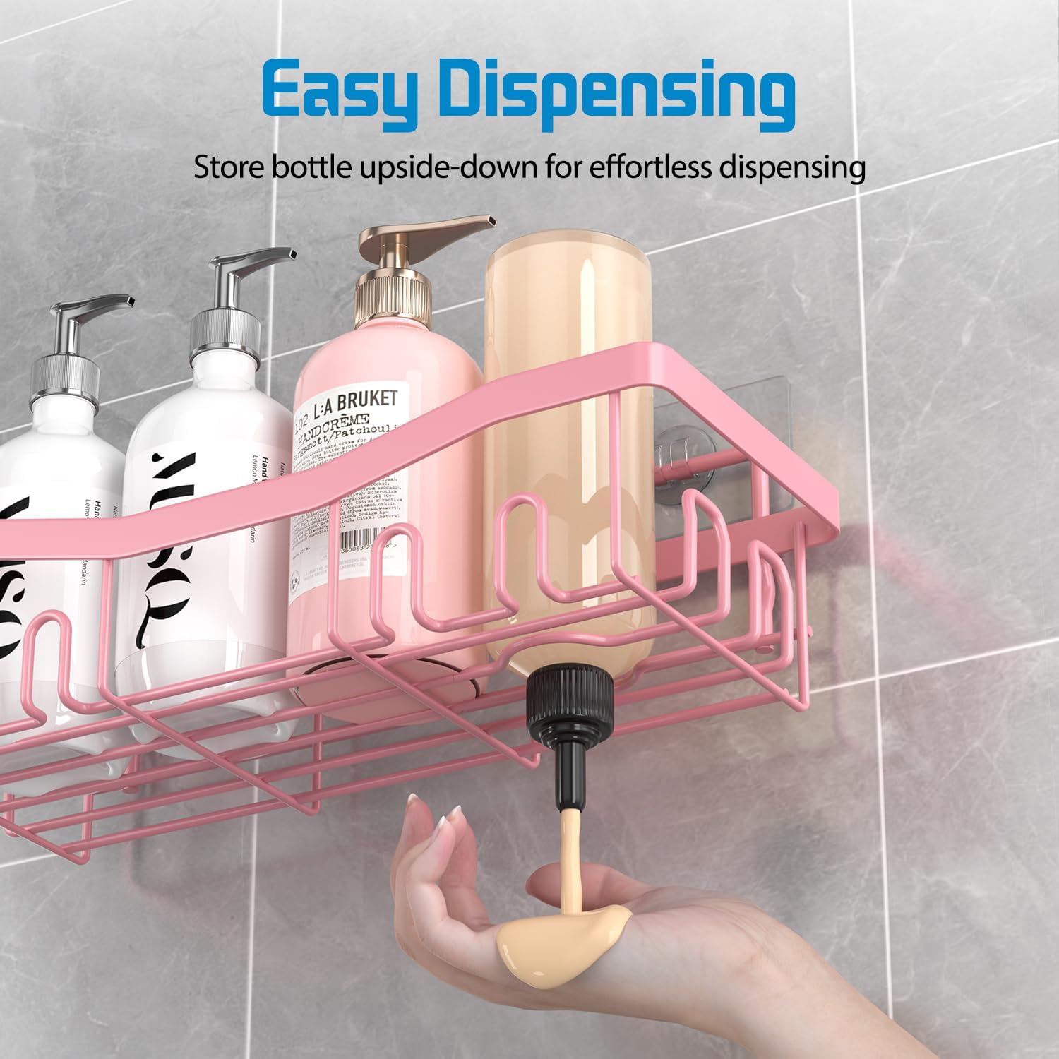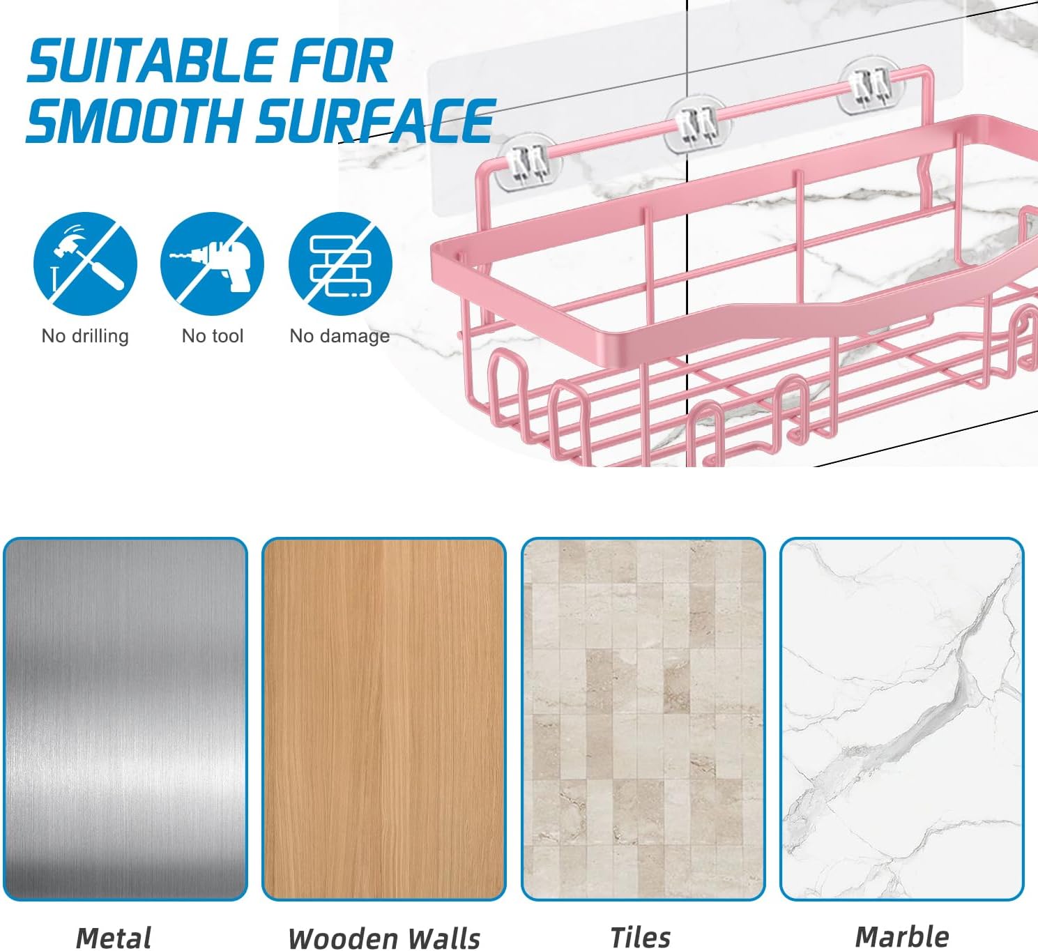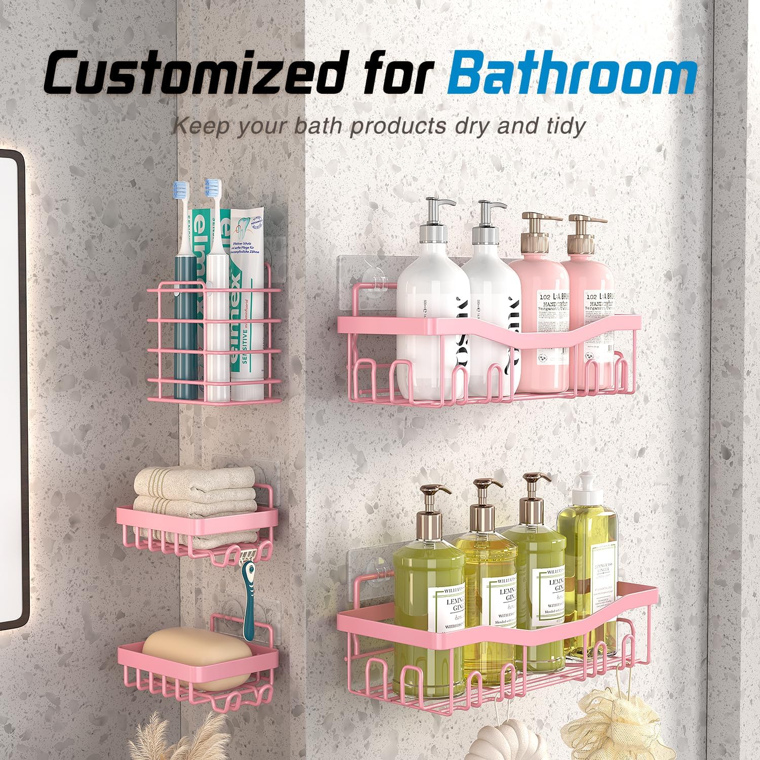 Adhesive Shower Caddy, No Drilling Bath Organizers 5 Pack, Rustproof Shelves with Soap Holder & Toothbrush Holder, Pink Bathroom Accessories Decor Set