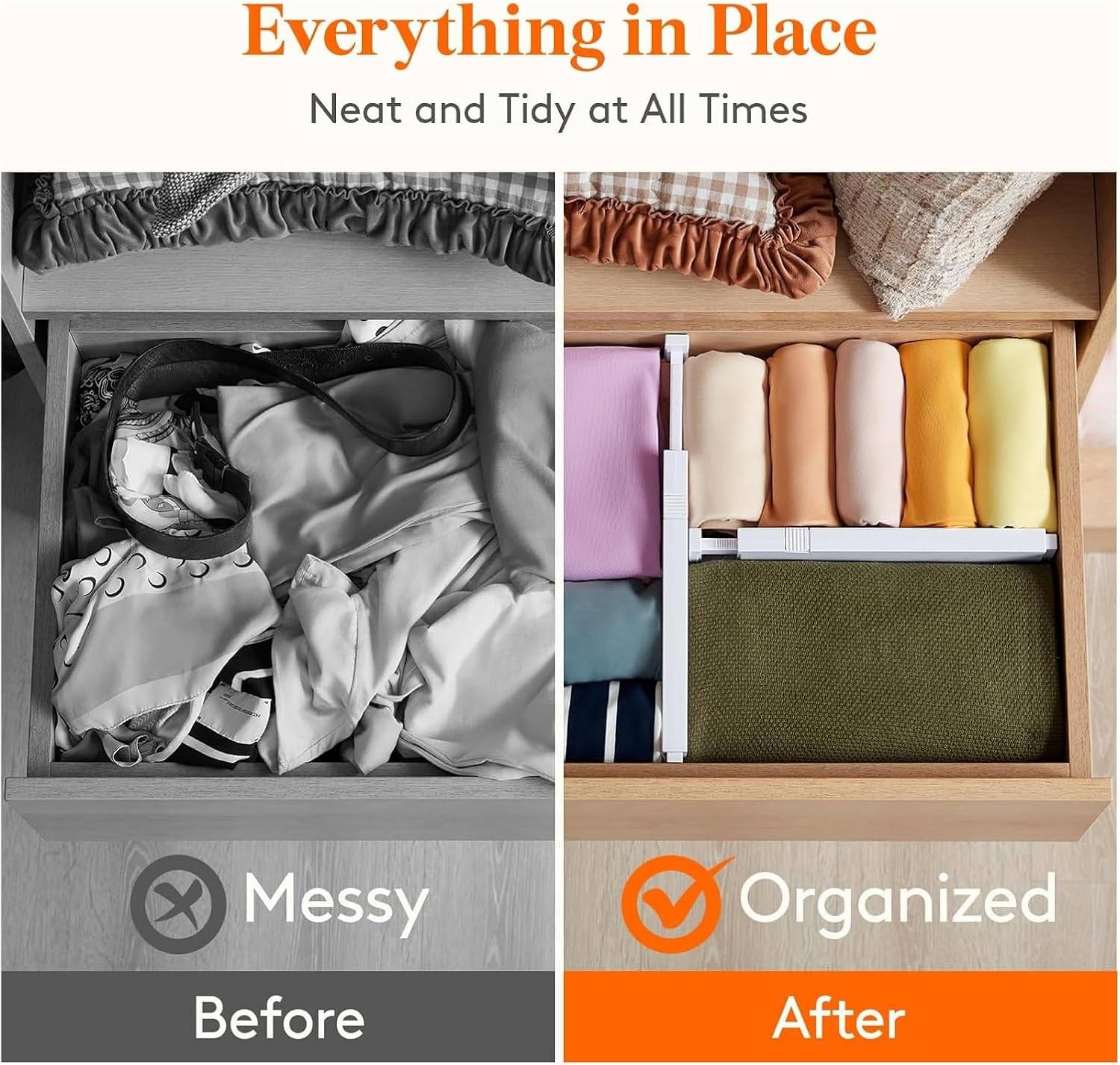 🧺 FOR LIGHT TO MEDIUM ORGANIZATION Ideal for organizing utensils, clothing, socks, accessories, and office supplies. Not intended for heavy tools or high-impact use. 🏠 MULTI-ROOM USE Suitable for kitchens, bedrooms, bathrooms, closets, and office drawers with flat, straight interior walls.