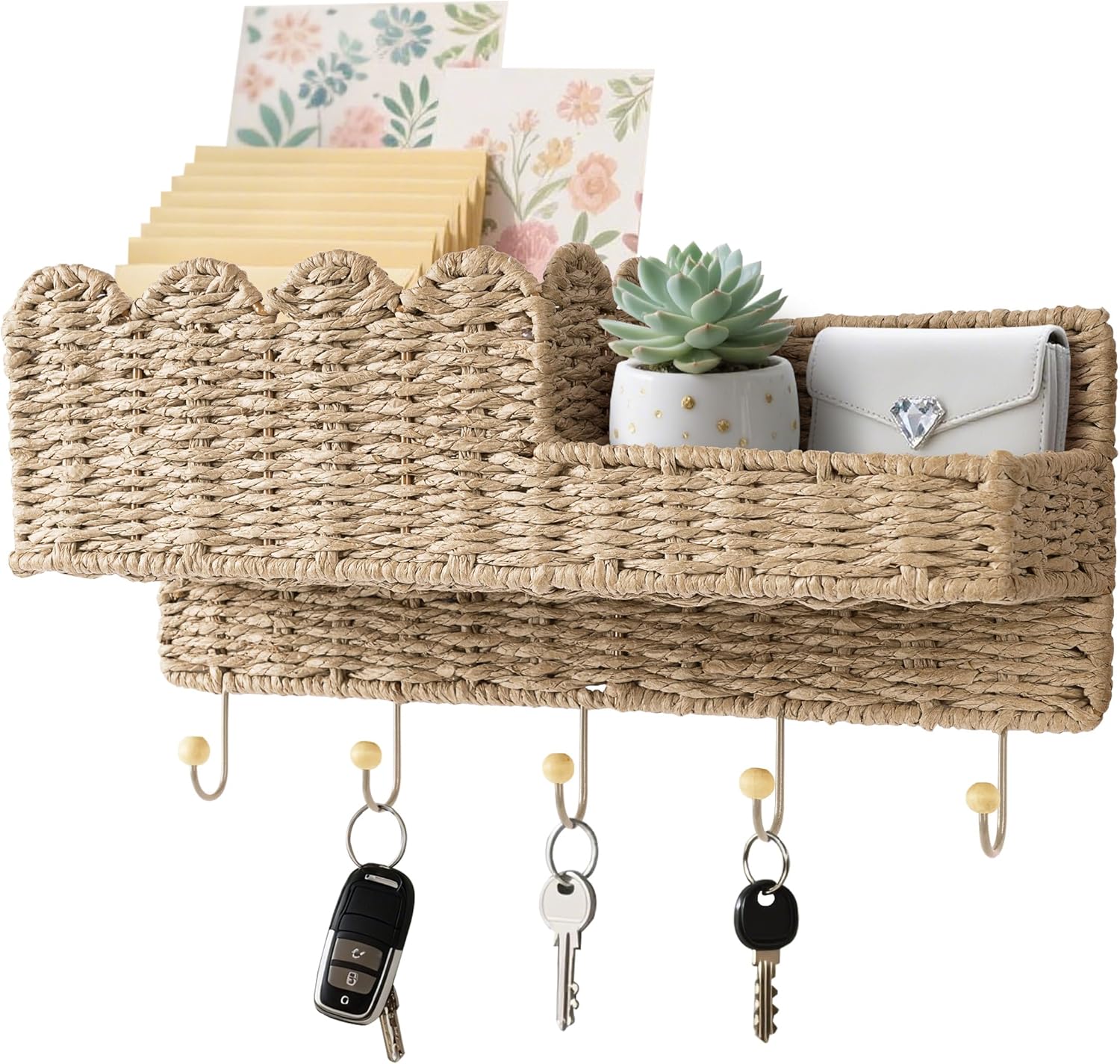 Stylish Decor: This paper rattan key holder fits perfectly in entryways, kitchens, bedrooms, or any space needing convenient storage. Its charming scalloped design keeps keys, mail, and essentials organized while adding a warm, decorative touch to rustic, boho, or modern homes