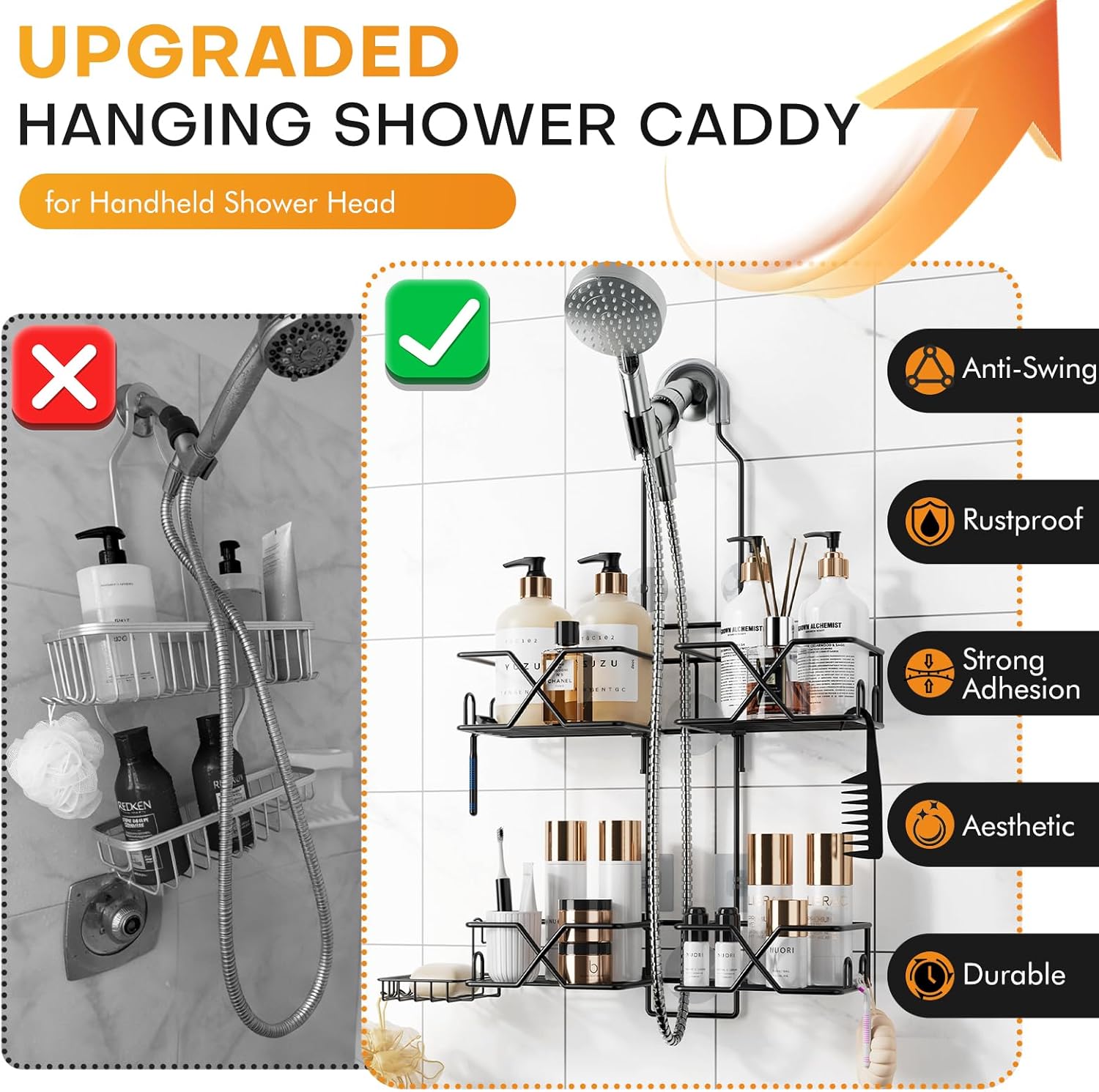 Aeocidy Adjustable Height Shower Caddy Hanging for Handheld Shower Heads, Shower Racks with Soap Holder 8 Hooks, No-Drilling, Anti-Swing, Bathroom Storage Shower Organizer