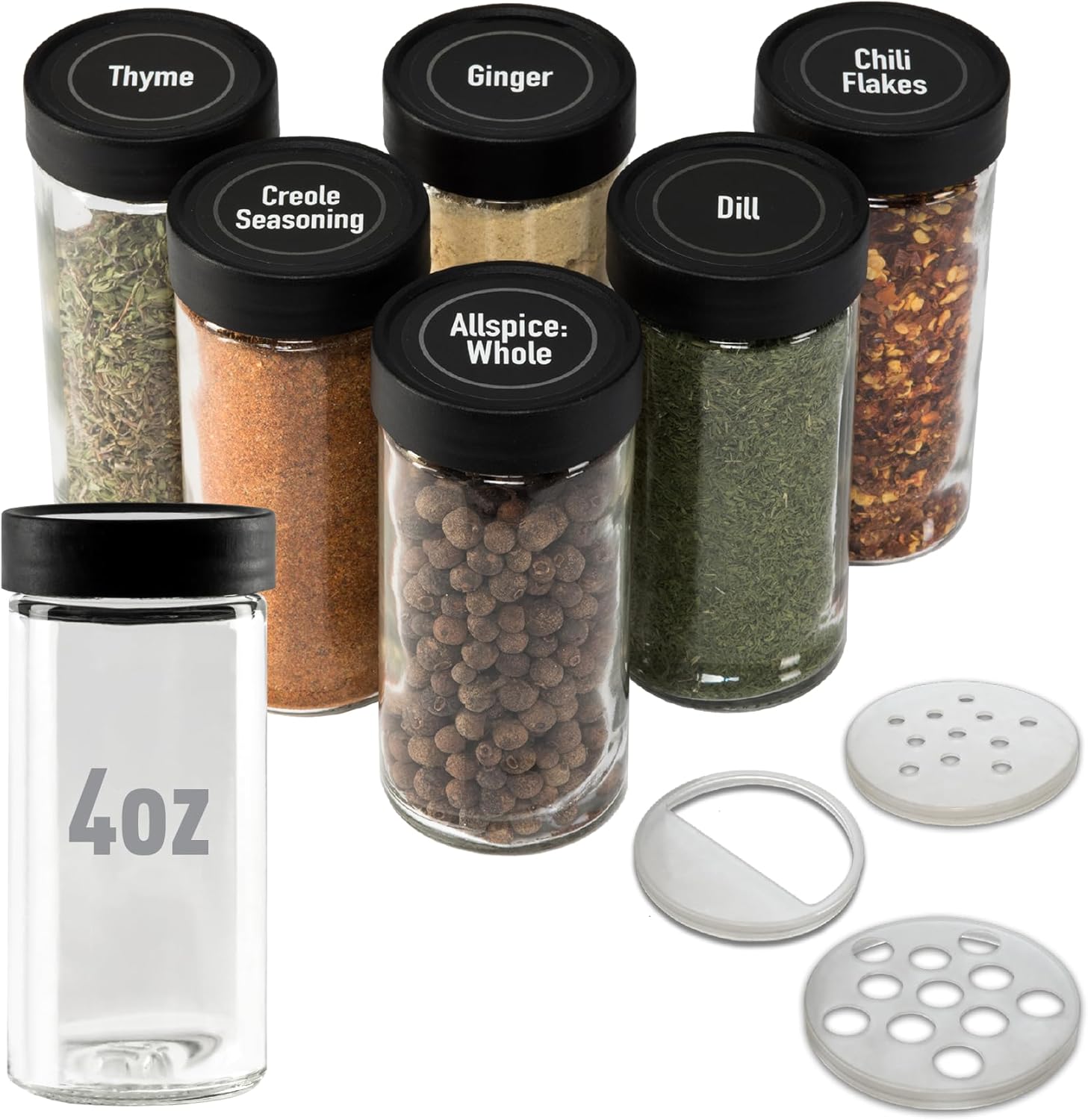 6 4oz GLASS SPICE JARS: Includes black plastic lids and 18 shaker tops (spice jar labels sold separately)