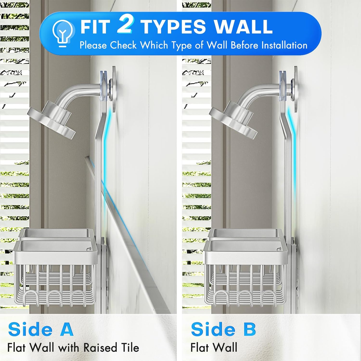 [Adjustable Height Shower Organizer Hanging] – With an updated adjustable height feature,over the shower head caddy is suitable for people of different heights.You can easily adjust the distance between caddy and showerhead,accommodating various heights of bath bottles which prevents it from blocking the showerhead and affecting the use of the shower head