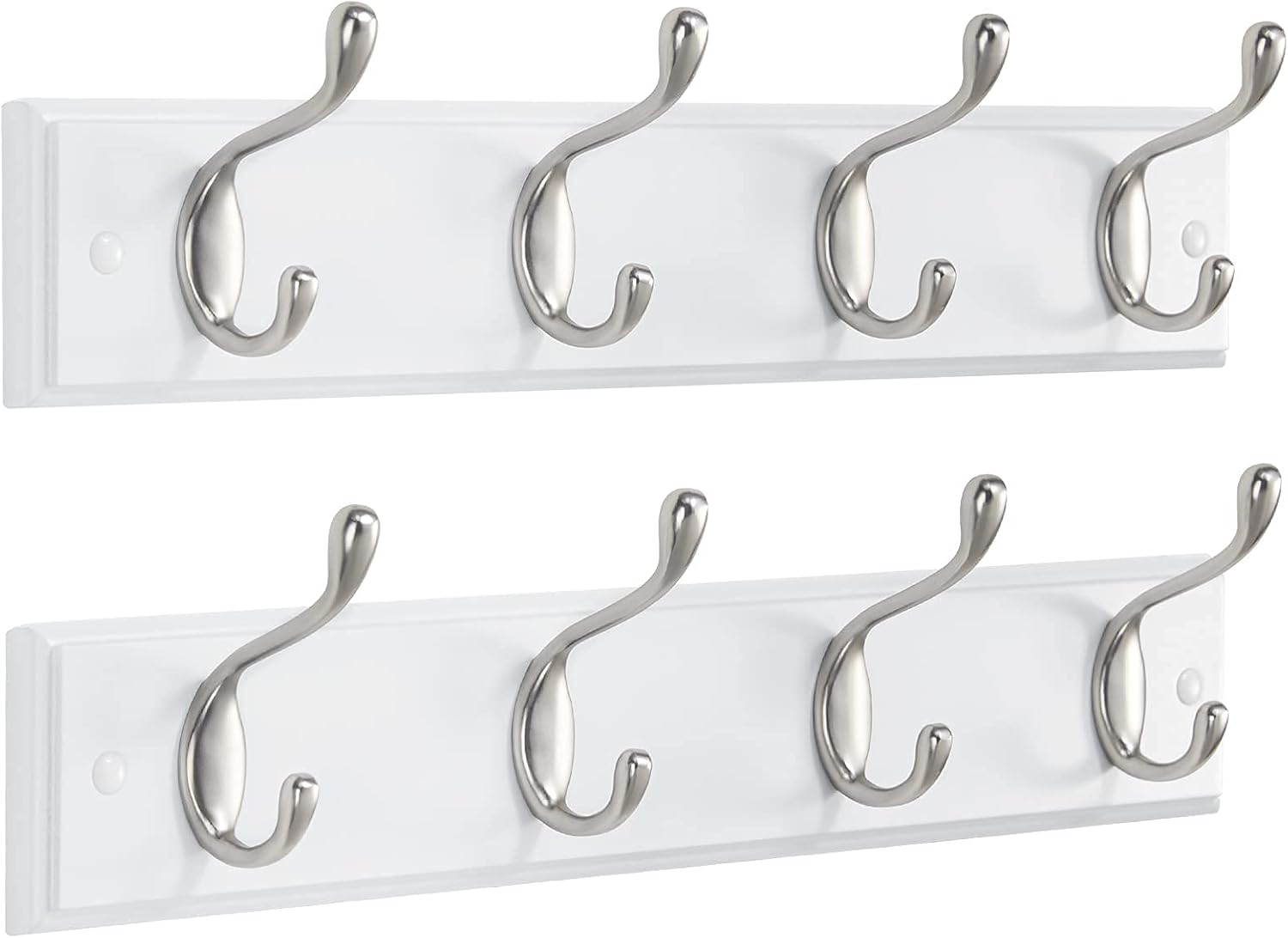 Modern Coat Hooks for Wall: White smooth MDF board and 4 sturdy zinc hooks match all kinds of home décor. Comes with 2 screw caps, which cover the holes for a flawless look. Veneer type finish, so it’s easy to keep clean.