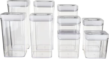 This versatile 14-piece set includes seven glass food containers with lids. The collection features two rectangular 1.6-cup containers, two rectangular 4.5-cup containers, two round 1.7-cup containers, and one round 4-cup container, all with matching lids. These glass kitchen storage containers have a non-porous construction that do not retain odors, flavors, or stains. Suitable for freezer, microwave, and oven use, these glass containers are adaptable to any meal planning or storage task. Locking lids create a leak-proof seal, transforming these glass pantry storage containers into efficient organizers for sauces, soups, and other liquid-based dishes.