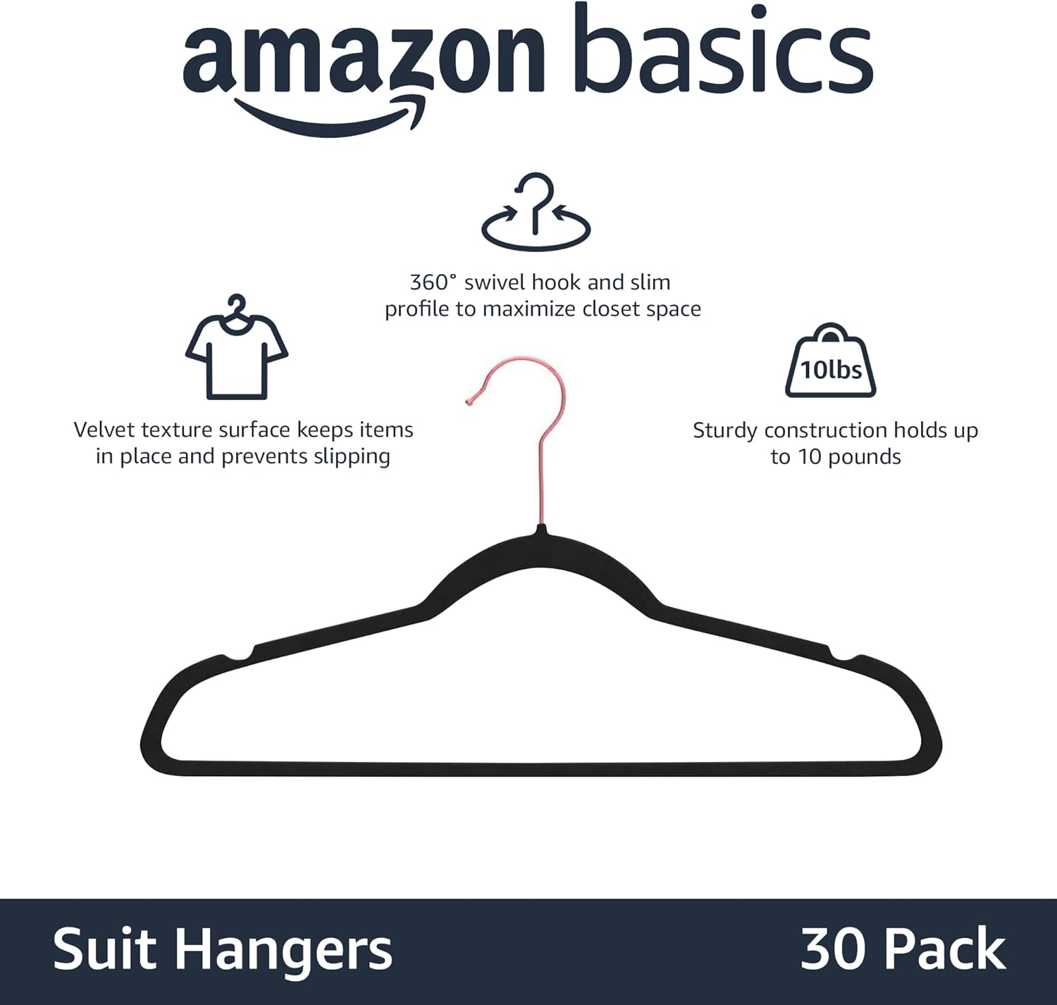 Amazon Basics Slim Velvet Non-Slip Space Saving Sturdy Suit Clothes Hangers, Closet Organizer, Black/Rose Gold, 30-Pack