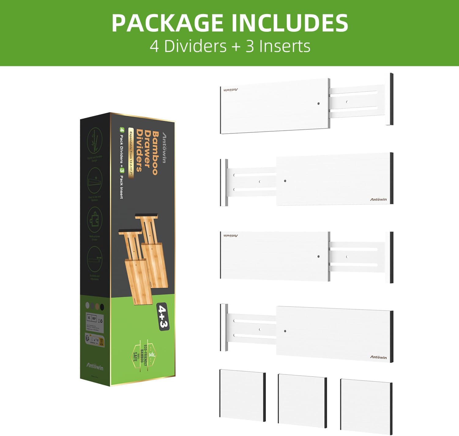 ANTOWIN 4 Pack Expandable Drawer Dividers, 4.7” High, Extend from 12.2” to 17.7”, Dresser Drawer Organizers, Bamboo Separators for Kitchen, Bedroom, Office, Bathroom (White)