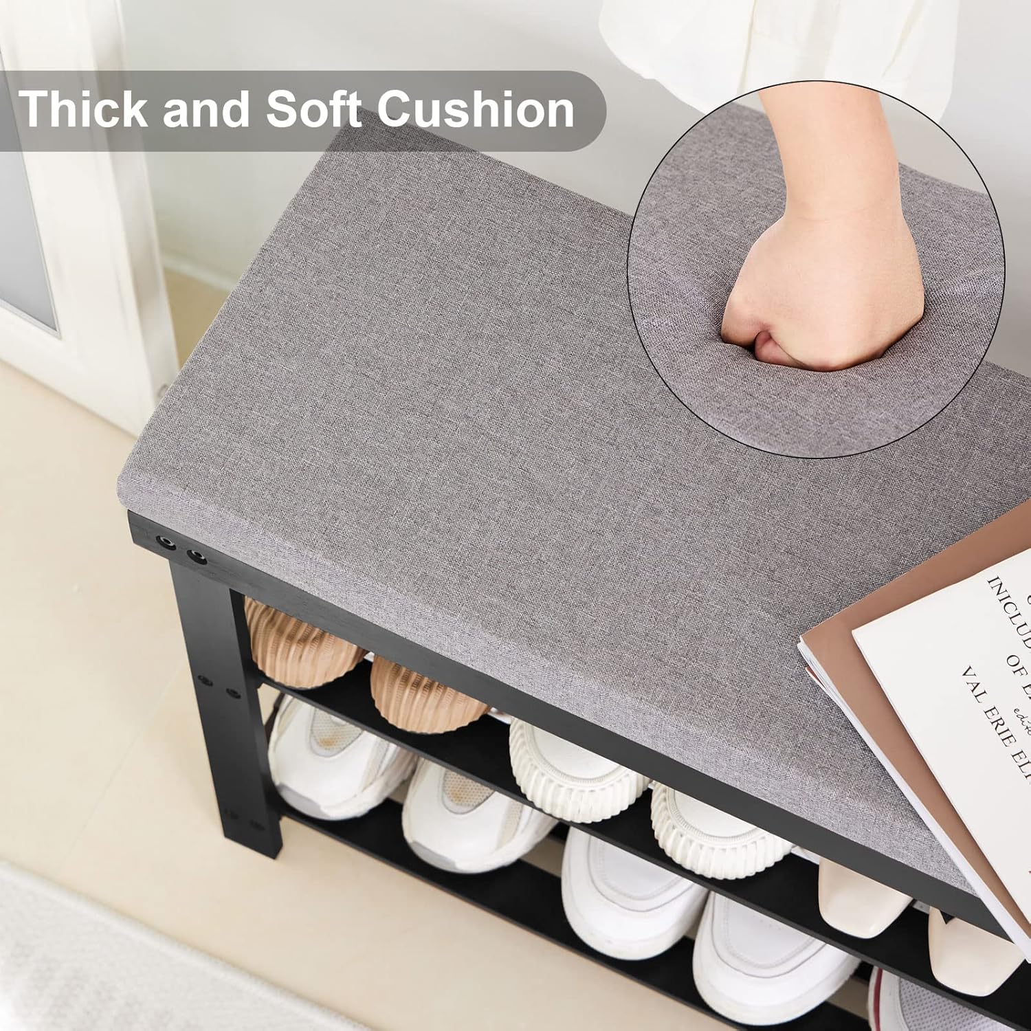 Apicizon 3-Tier Shoe Rack for Entryway, Bamboo Shoe Bench with Cushion Padded Seat, Small Shoe Organizer with Storage for Indoor Entrance Hallway Bedroom Living Room, Black