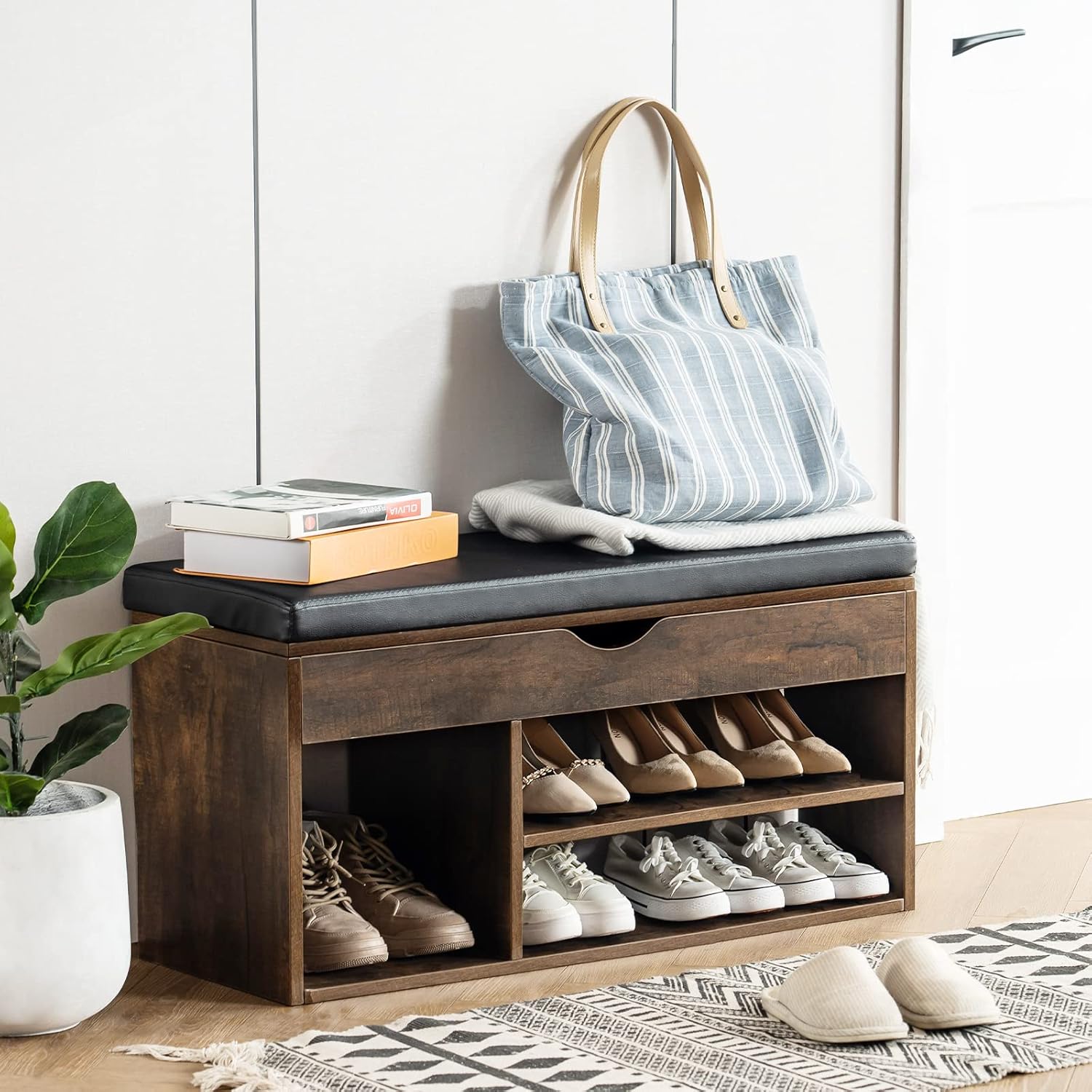 Apicizon 39 Inches Storage Bench with Padded Cushion, Shoe Bench with Storage Space, Upholstered Entryway Bench for Living Room, 2-Tier Shoe Rack Organizer, Brown
