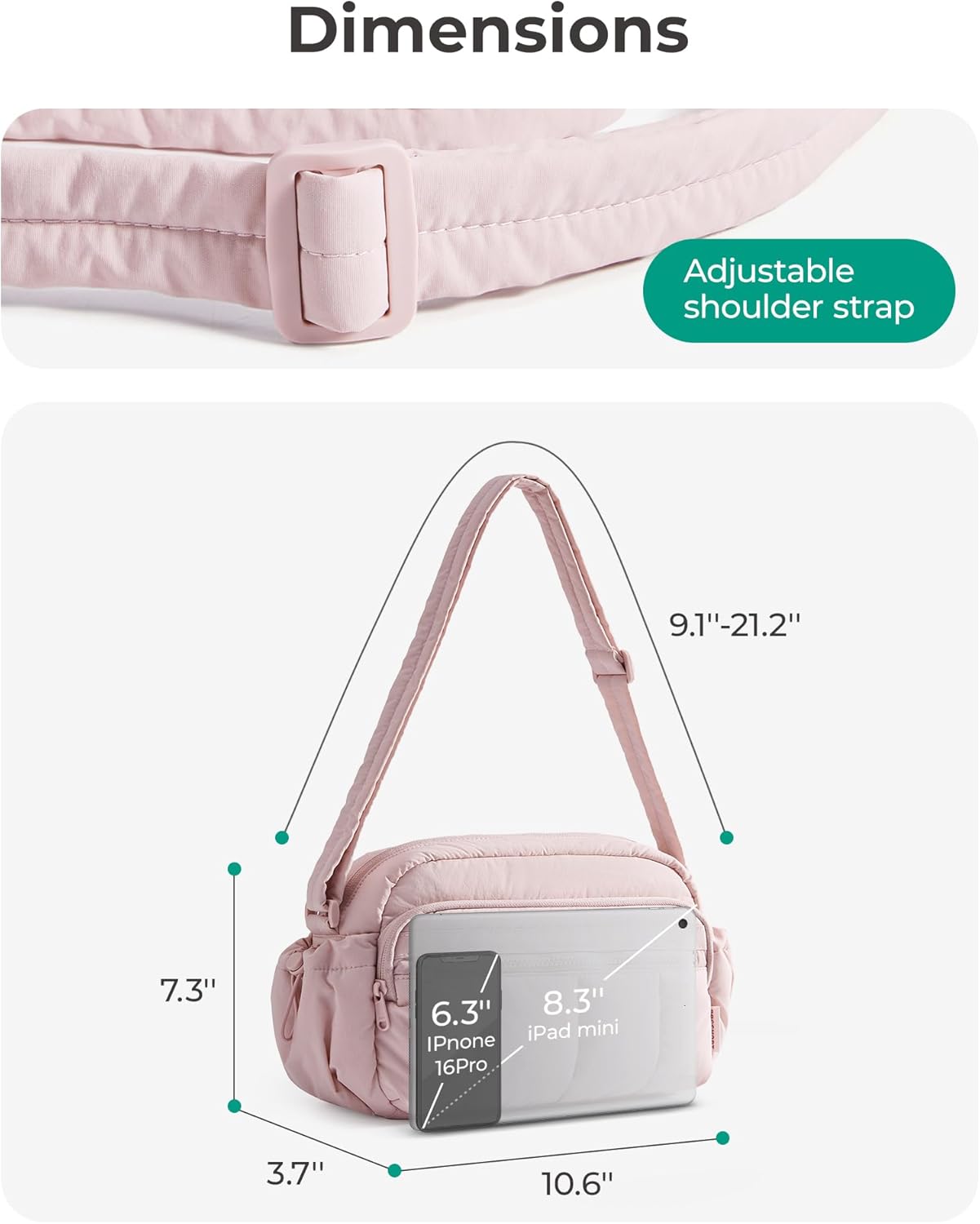 Material & Size: Lightweight & water-resistant puffy travel purse (just 0.6lbs)! Compact size 10.6”x3.7”x7.3” with 4.7L capacity – perfect daily essentials