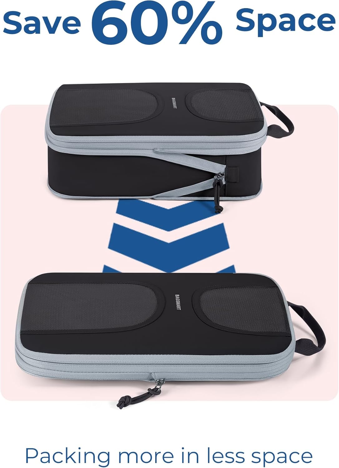 SAVE 60% SPACE: Just like how a vacuum sealer works. With our compression travel cubes, you can easily compress clothing and other essentials into a compact shape, freeing up to 60% of luggage space. Imagine being able to hold twice as much stuff in your luggage without compromising on style or comfort. Whether you’re planning a weekend getaway or a trip around the world, our storage bags are a must-have solution for savvy travelers like you.