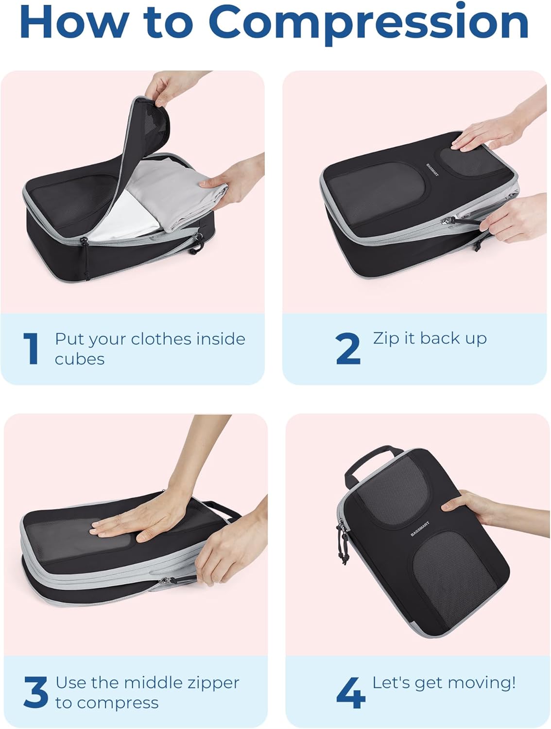 BAGSMART Compression Packing Cubes, 6 Set Packing Cubes for Suitcases, Lightweight Suitcases Organizers Bag Set & Compression Travel Cubes, Travel Essentials Packing Organizers Black