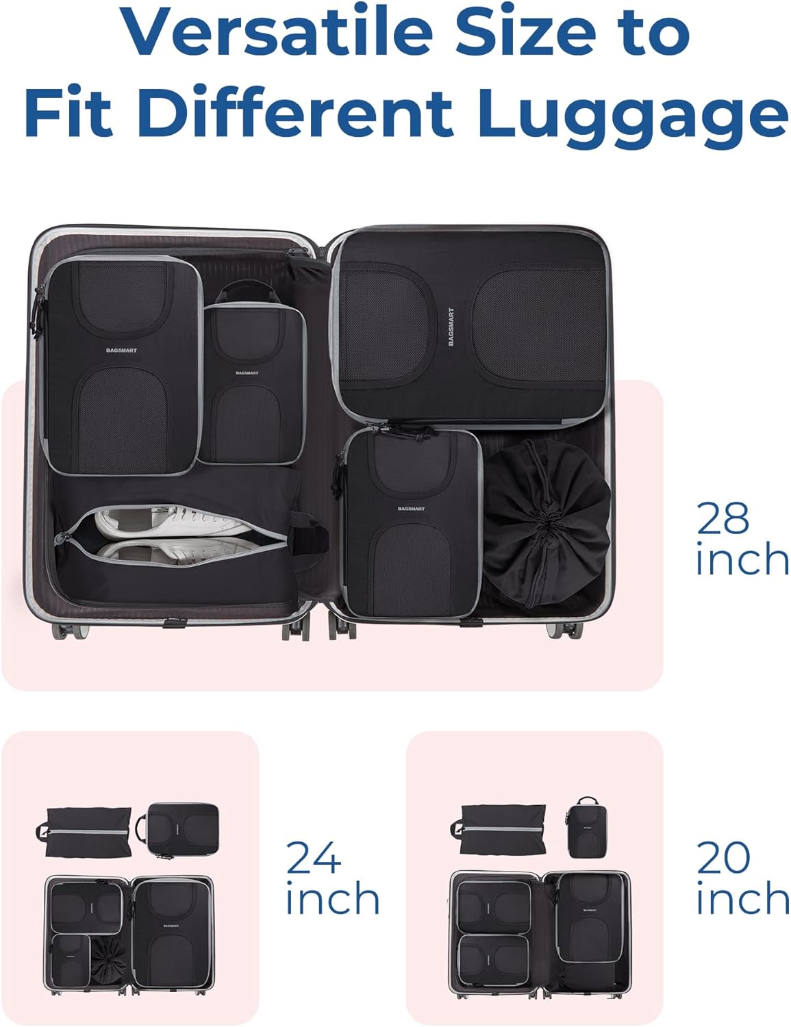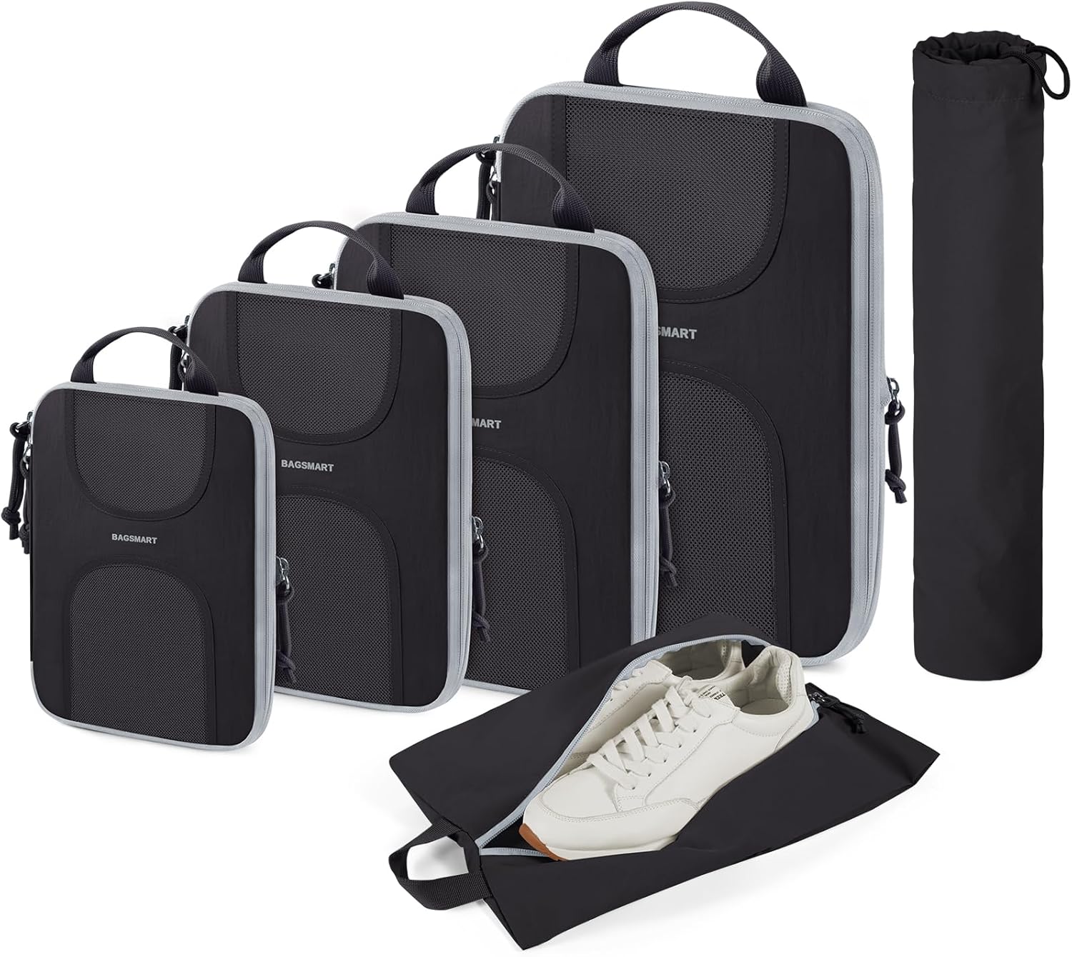 KEEP PACKING ORGANIZED: BAGSMART 6 set compression packing cubes includes 1 extra large cube (11.6” x 15.9”), 1 large cube (9.2” x 13”), 1 medium cubes (8.2” x 11.4”), 1 small cubes (6.5” x 9.0”), 1 drawstring bag (13.0″ x 17.7″) and 1 shoe bag (9.0″ x 16.9″). Different sizes can be used for different packing purposes, helping us quickly sort, organize and find our items while traveling. Say goodbye to messy suitcases and keep your clothes organized.