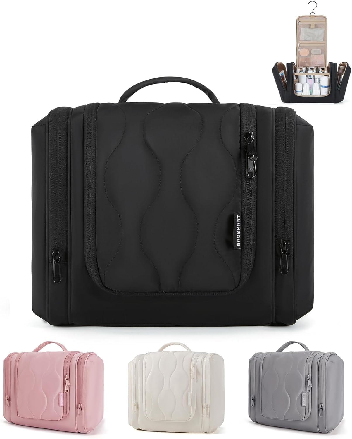 BAGSMART Travel Toiletry Bag for Women, Puffy Hanging Toiletry Bag with Hook, Water-resistant Toiletry Organizer for Full Sized Toiletries, Black