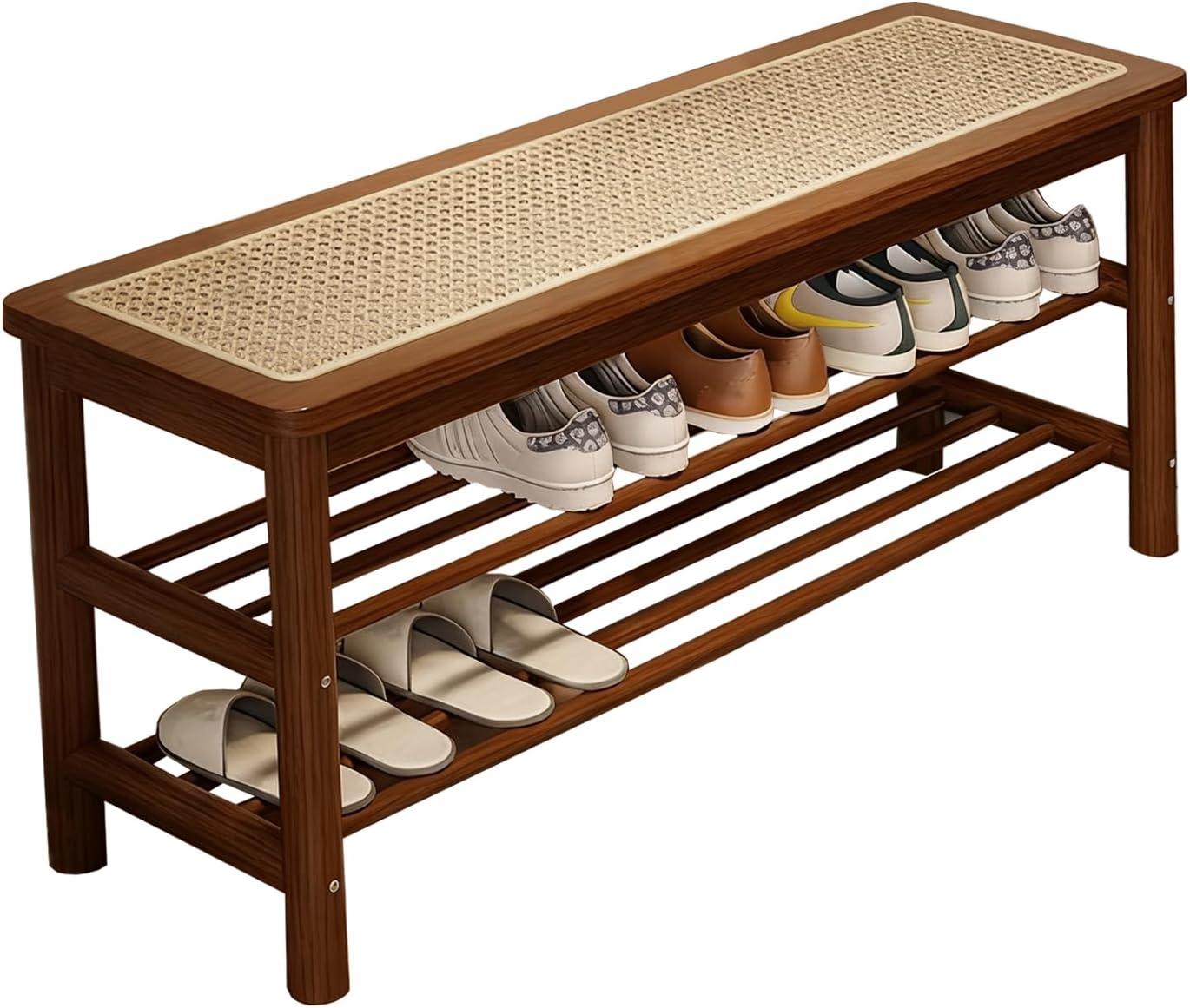 Bamboo Entryway Bench with Woven Rattan Seat — 2-Tier Shoe Storage Bench for Hallway & Entryway 39.4 inches Walnut