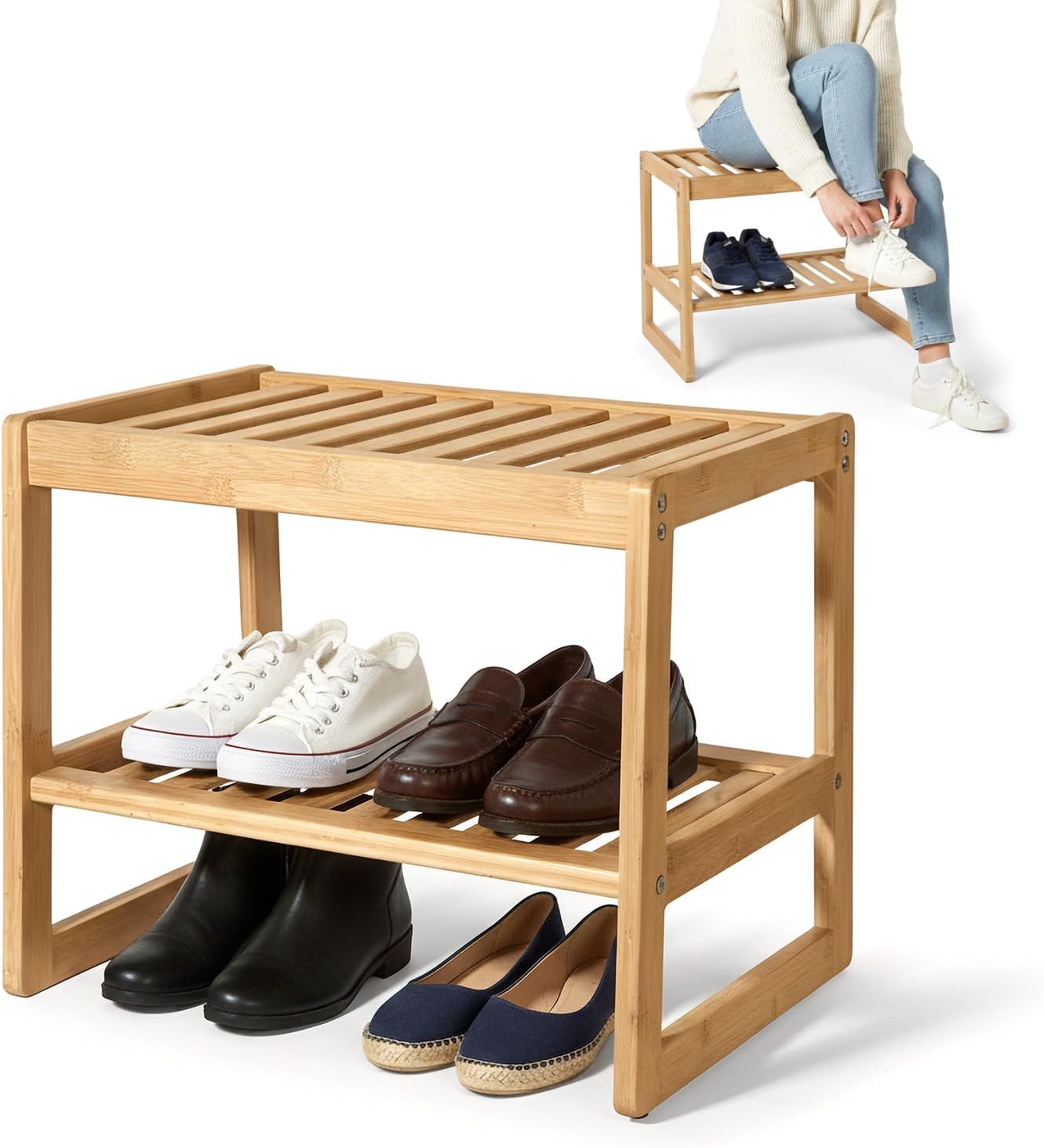 SHOE RACK STOOL: This shoe rack stool is made of high quality natural bamboo for durability and the non-slip silicone feet prevent the bench from sliding on the floor. The Shoe Rack Bench is perfect for an entryway.