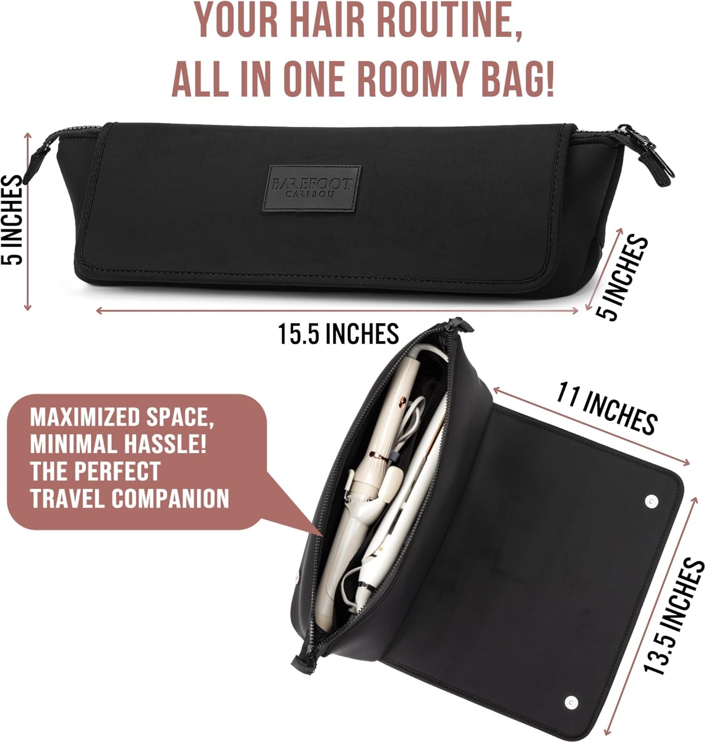 Store and Protect Hair Tools with a Multipurpose Travel Bag Designed for Modern Hairstyling Accessories There are few days that go by where you aren’t using a flat iron, curling iron, or other hairstyling tools. And if you’re like most people, you set them down on the counter, which can lead to damaged surfaces, or stuff them in a travel bag when you’re on the go, which can damage the devices themselves. That’s why we created a smarter, simpler solution for home, travel, and on-the-go use. The Barefoot Caribou Hair Tools Travel Bag offers true versatility for people who love using hot styling tools and need a better way to keep them protected before, during, and after daily use. Product Details: 2-in-1 Hair Tool Storage Bag Heat-Resistant Padding Heavy-Duty Neoprene Compact, Portable Travel Use Large Carry Capacity Dimensions: 15.5” x 5” x 5”; Inner Pad Size: 11” x 13.5”