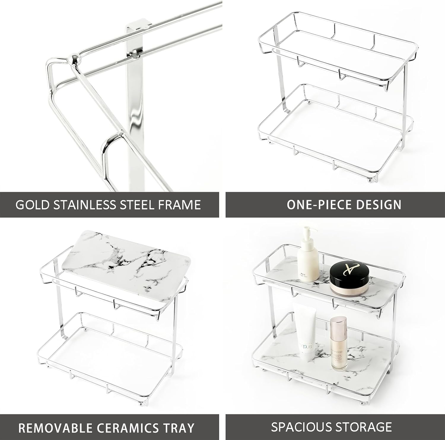 EASY TO CLEAN: With a sturdy stainless steel frame that can prevent corrosion in wet places and removable ceramic trays with a luxurious marble pattern, this dresser top stand is both functional and easy to clean.