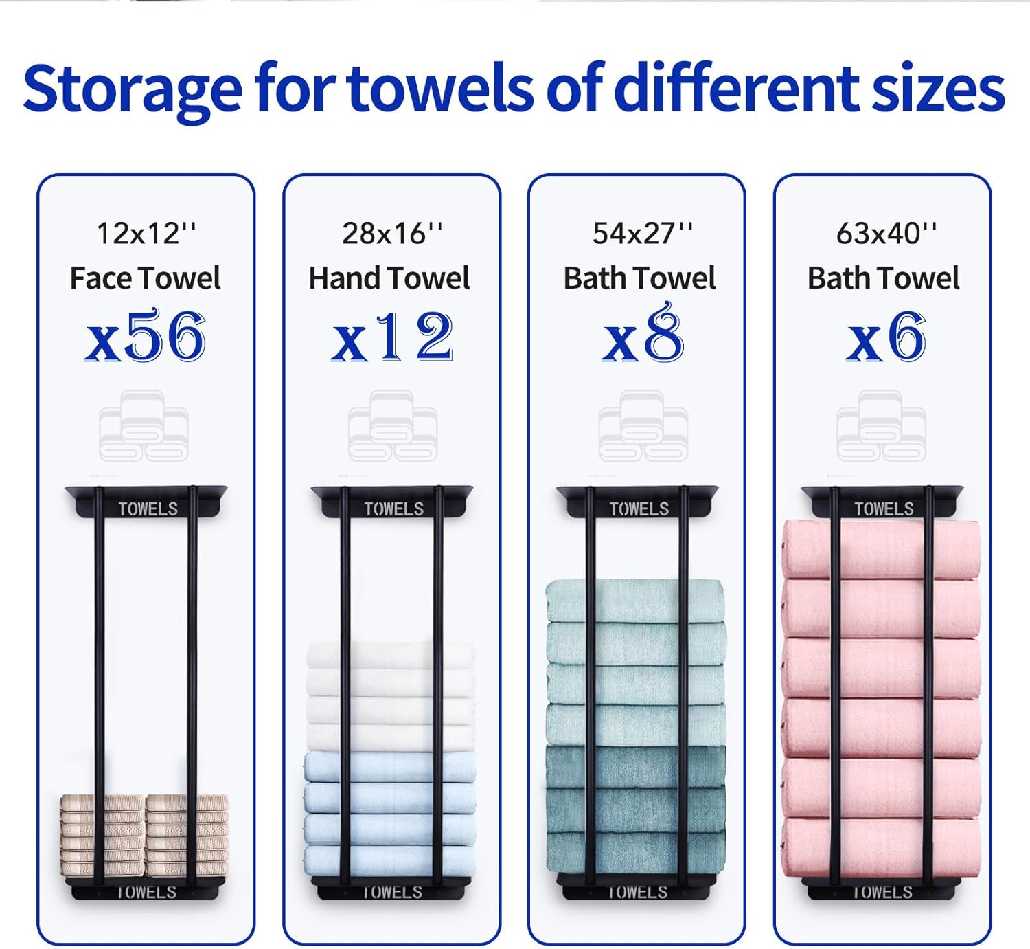 【LARGE STORAGE CAPACITY】Size: 11.8 “L x 5.9” W x 30.7 “H, 5.9inches from the wall. Say goodbye to cluttered and disorganized cabinets with this super storage space-saving solution. With its generous capacity, you can easily store multiple sizes of towels, from bath towels to hand towels, washcloths, and more. Plus, it’s easy to access, so you can grab what you need without any hassle.