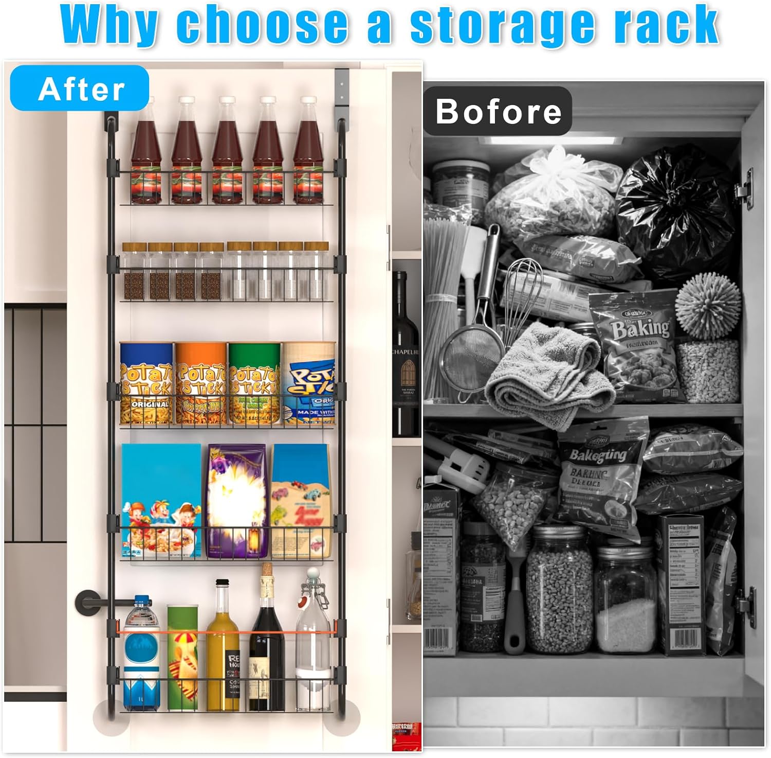 Height Adjustable Multifunctional Storage: This door storage rack can flexibly adjust the position of the basket according to the height of the items, making it more convenient to store items of different heights. When storing higher items, the protective railing can prevent them from tipping over and falling. Our seasoning rack can meet your different needs and can be used as a food storage room organizer, bathroom door rack, bottle rack, and cosmetics organizer. Very suitable for kitchens, food storage rooms, bathrooms, bedrooms, or laundry rooms. It will be a must-have for your family organization