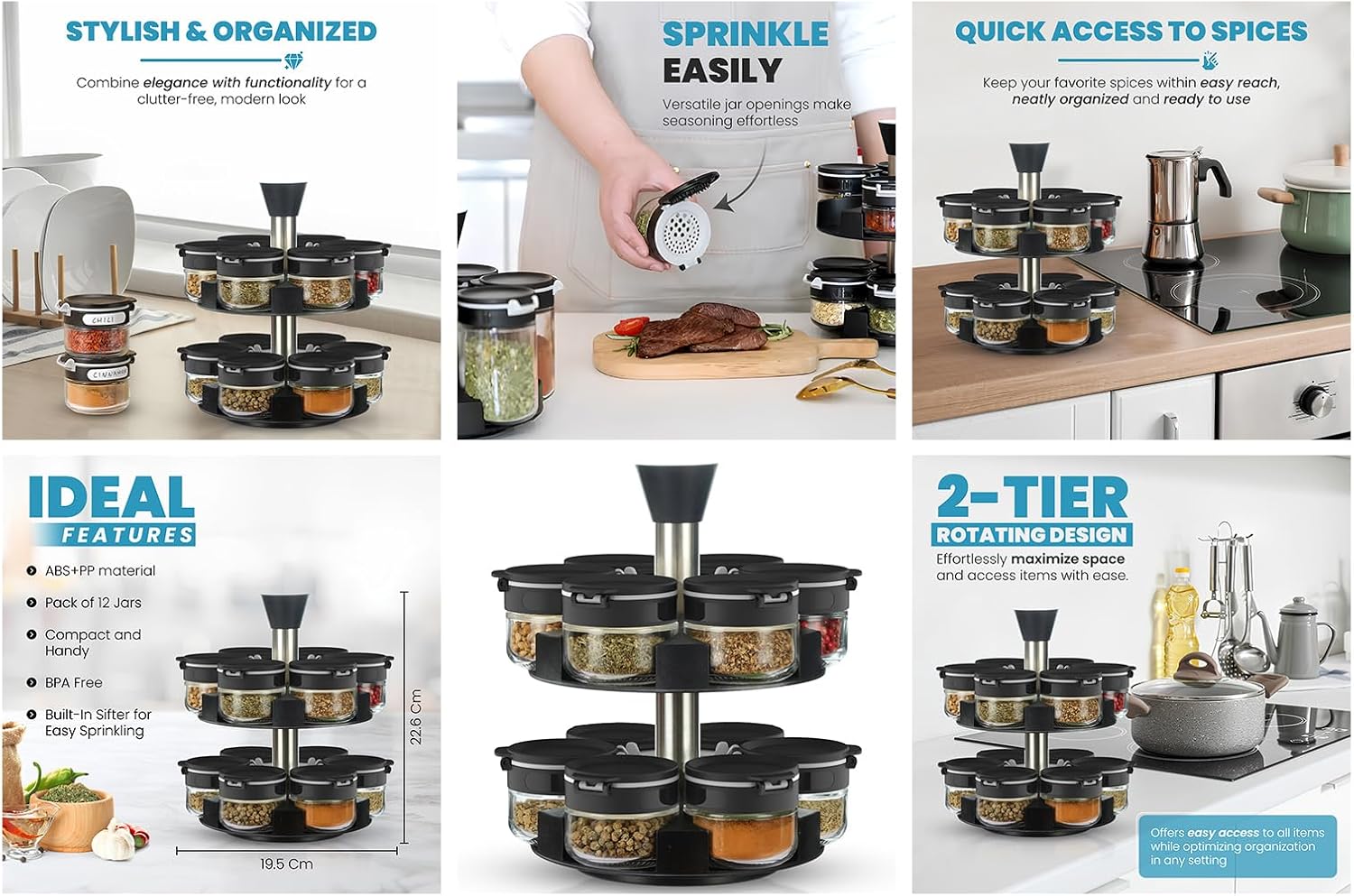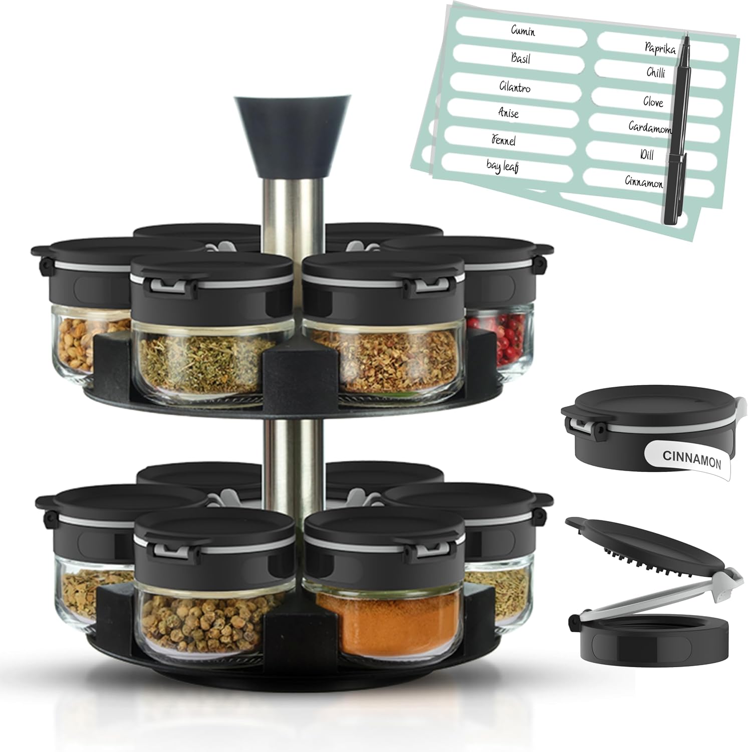 Black Rotating Spice Rack With Jars, Spinning Spice Rack For Countertop – Revolving Tower Organizer for Kitchen Seasonings – Kitchen Carousel Storage, Stainless Steel, 12 Jars
