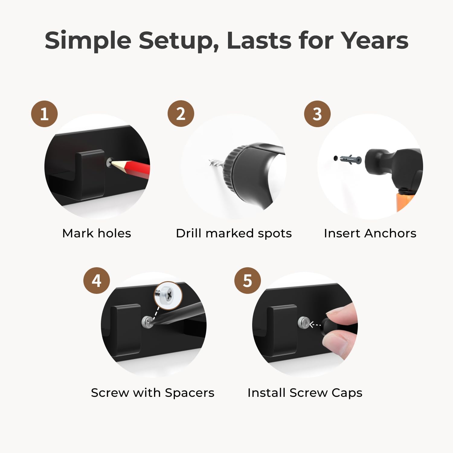 Easy to Install: Includes all screws, anchors, caps, and clear instructions; Mounts securely on drywall, wood, or tile—quick setup, no stress